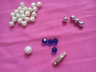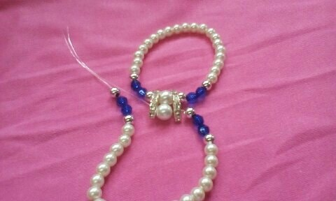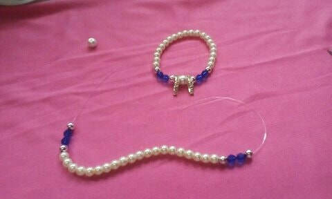 Cortar el nylon de 20 cm y colocarle las 20 perlas blancas, luego le agregamos las pepas doradas seguidamente la azul.