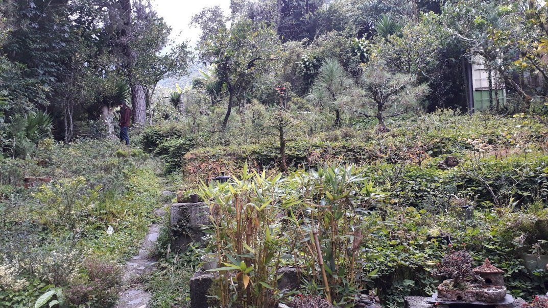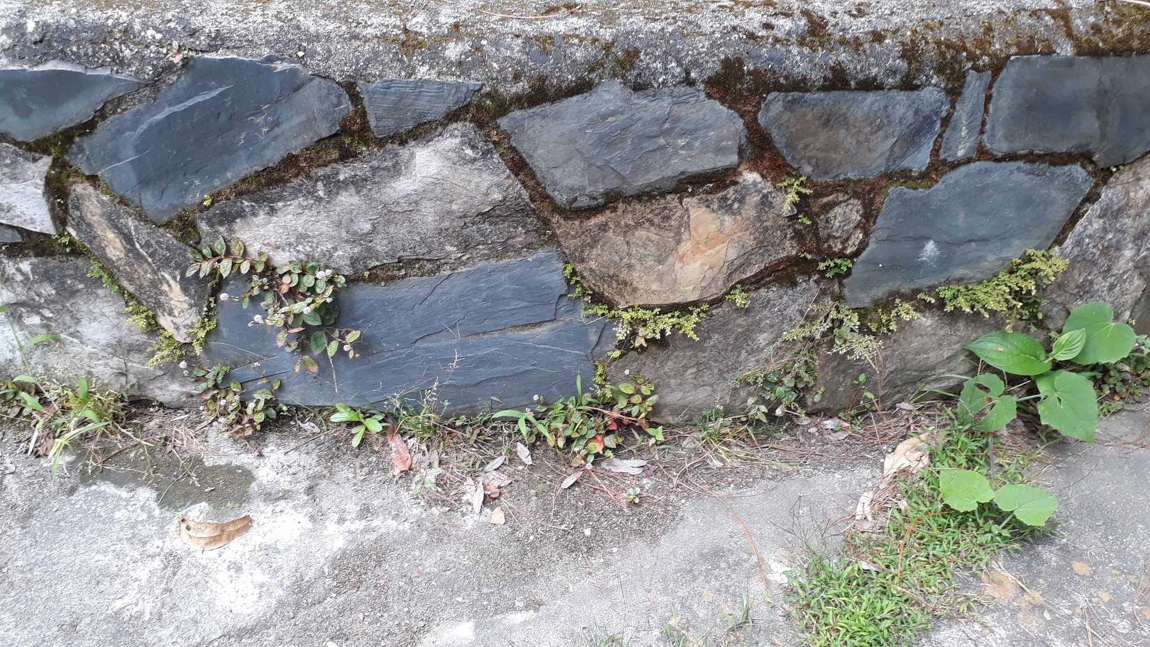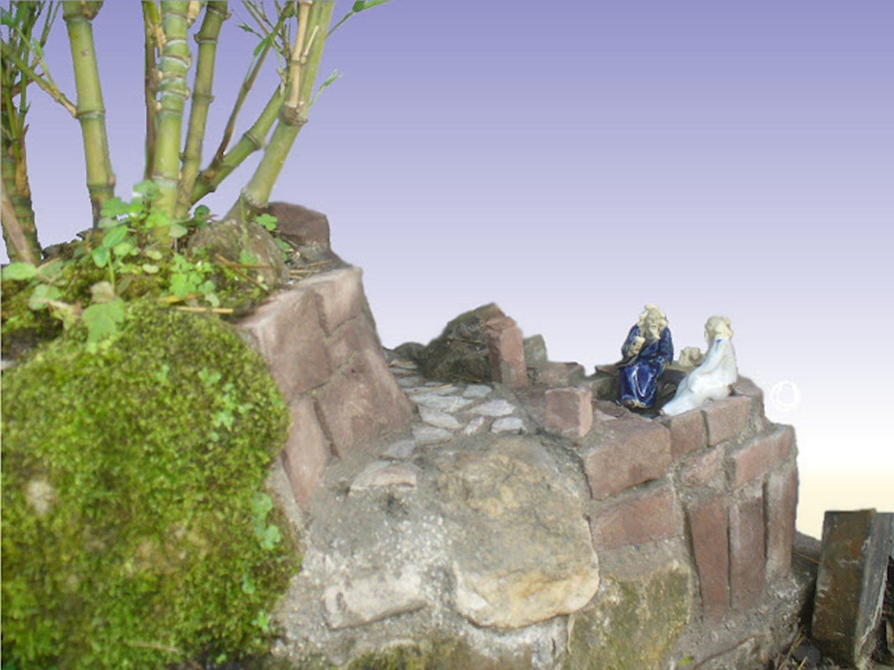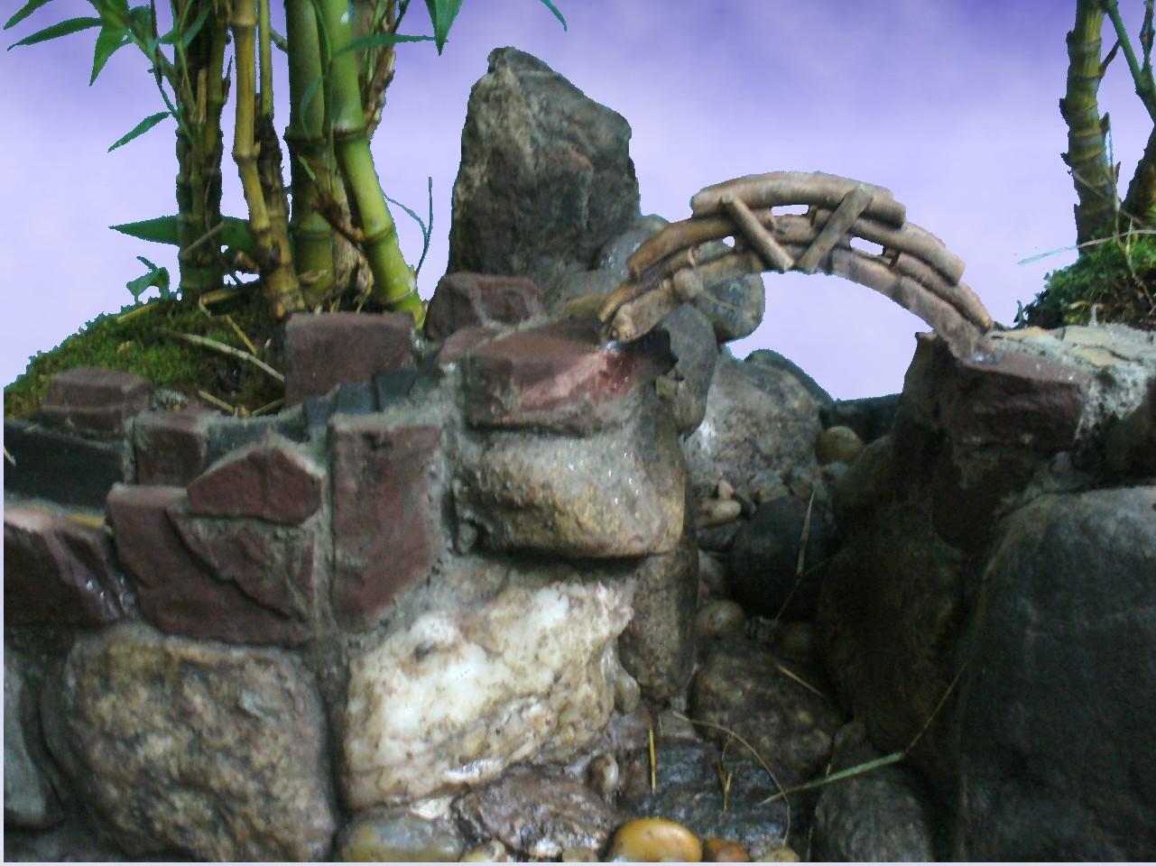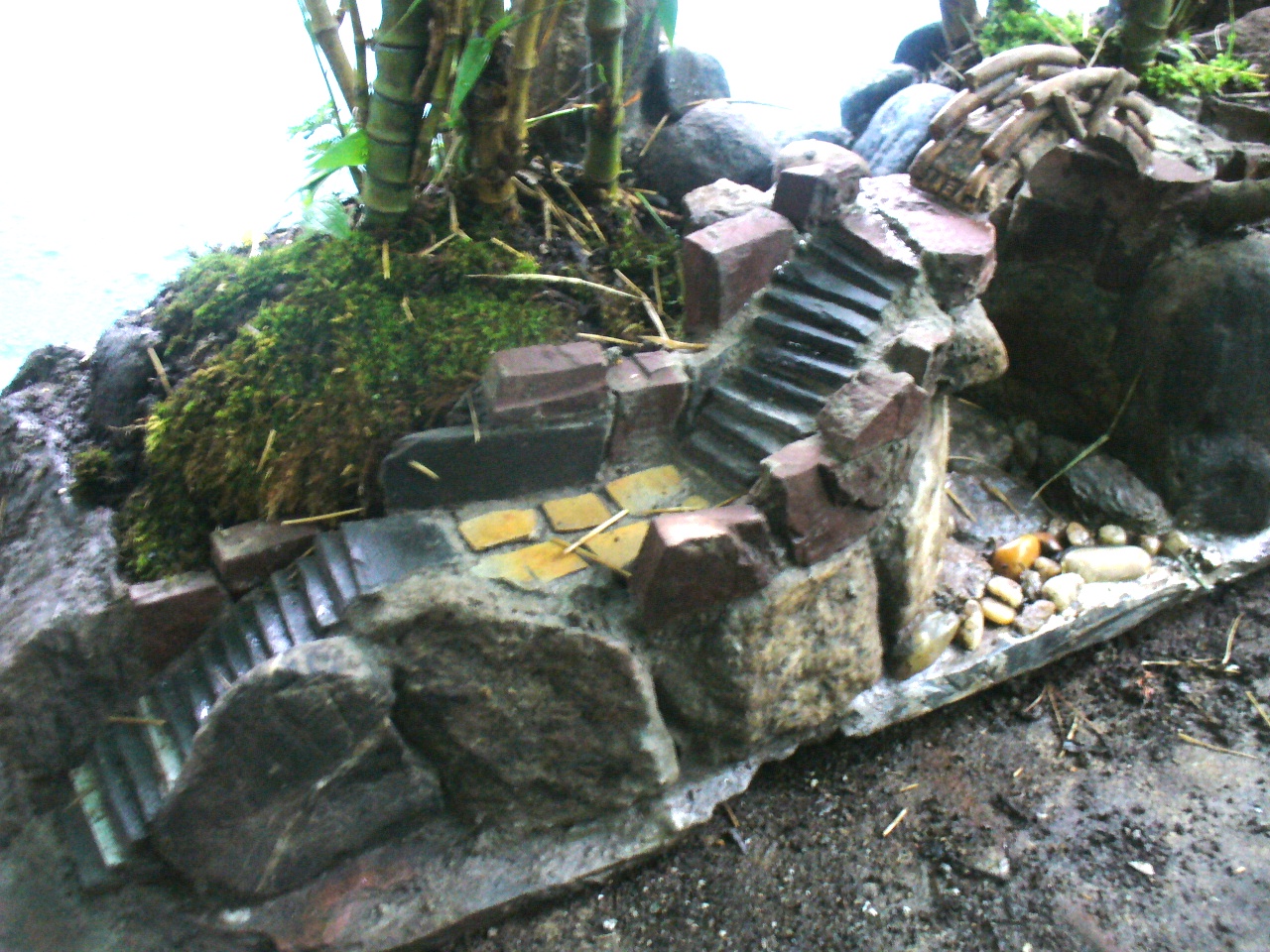 Las piedras fueron cuidadosamente cortadas con un esmeril y luego fueron pegadas entre sí con una mezclilla de cemento y arena. En la composición hay una vereda en medio de un bosque de bambú, en realidad es bambucillo (Chusquea spencei). El camino atraviesa un río mediante un puente de madera y al extremo de la vía hay una terraza donde un par de monjes orientales están reunidos tomando el té. Esas pequeñas miniaturas fueron adquiridas en un viaje que hicimos y son fabricadas en China.