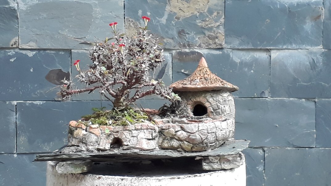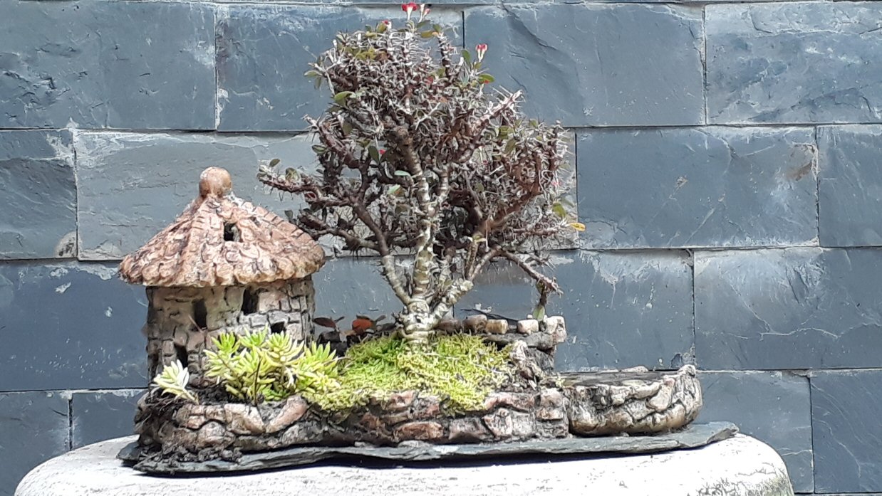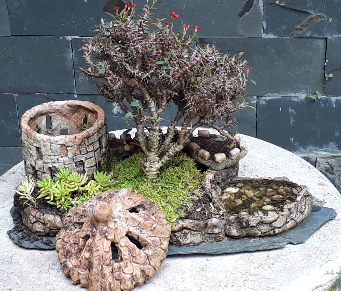 Últimamente estamos construyendo ya paisajes de muy pequeño tamaño y hechos casi enteramente de cerámica lo cual los hace muy livianos. En las fotos tenemos unas coronas de cristo (Euphorbia mili) sembradas en unos jardincillos encerrados entre muros de supuesta piedra. Un elemento arquitectónico complementa cada diseño aportándole un aspecto muy atractivo.
