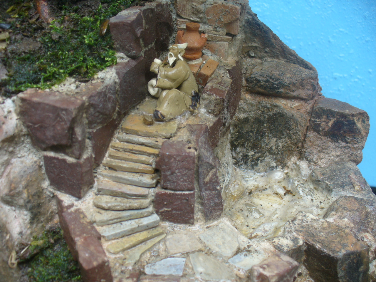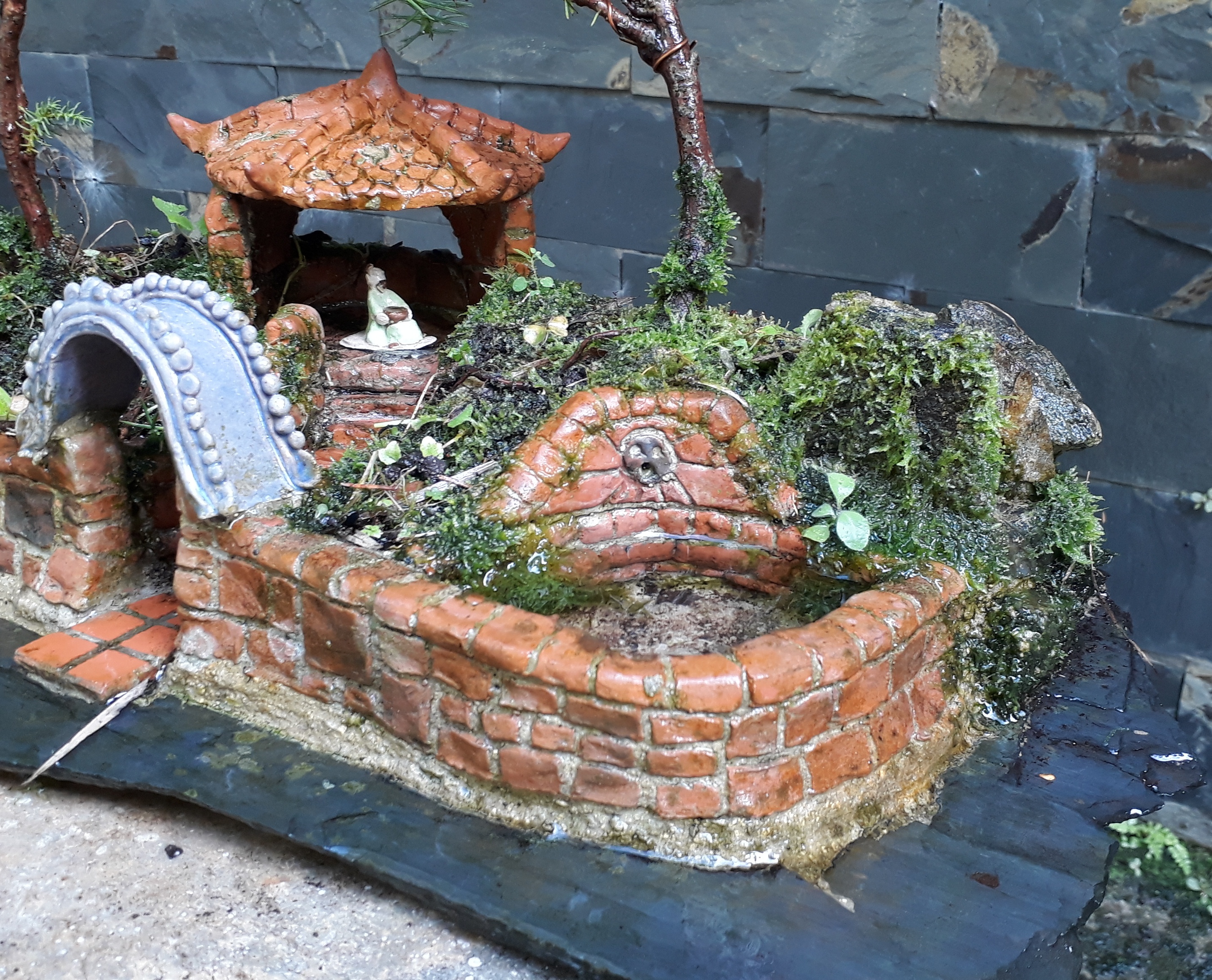 En el siguiente microambiente añadimos una pequeña pagoda al paisaje, en esta se encuentra un ceramista sentado en su torno y confeccionando un recipiente de barro. También, a uno de los lados, incorporamos un pequeño pozo cuya fuente está decorada con una imagen solar.