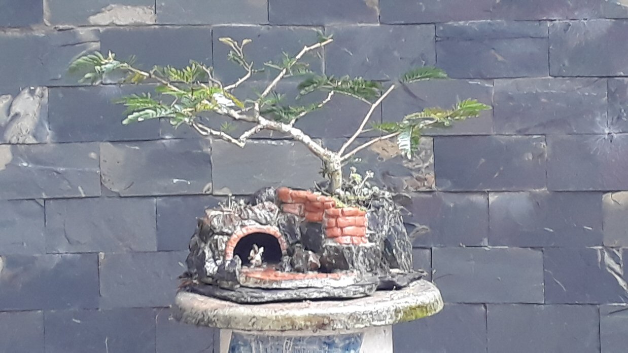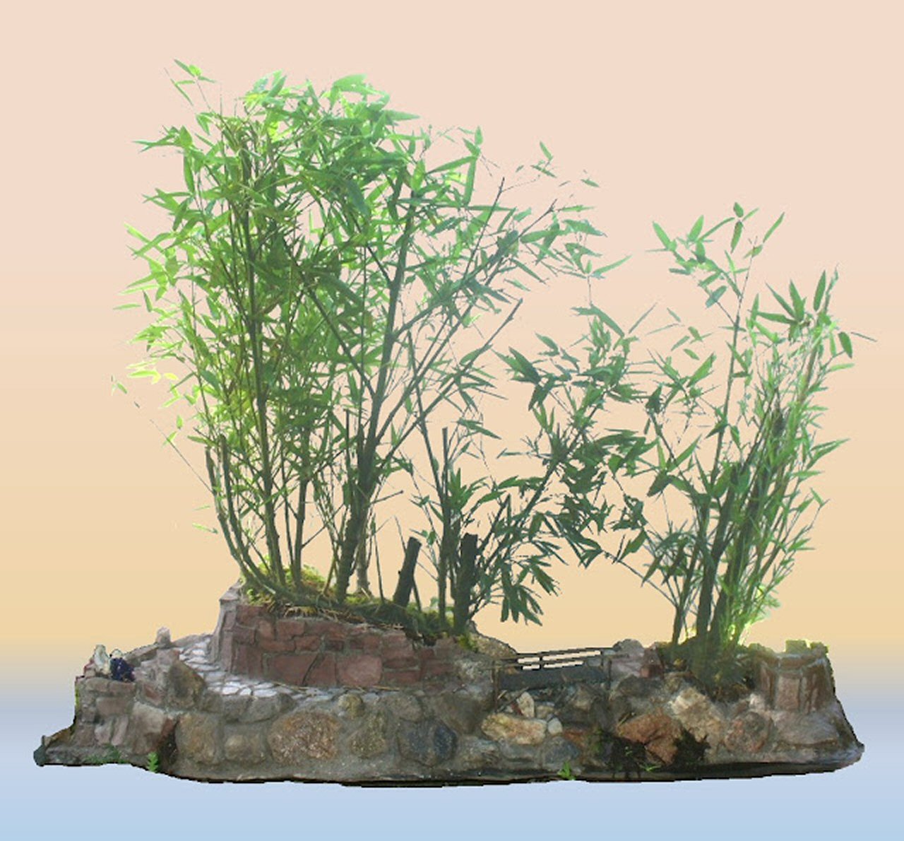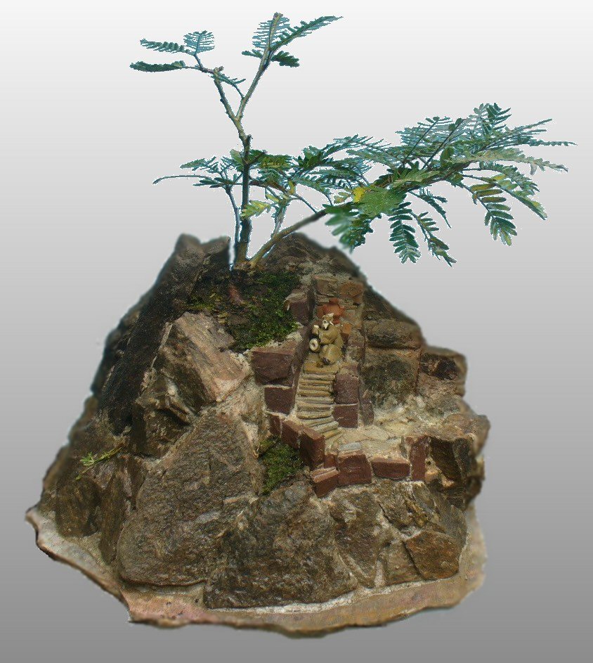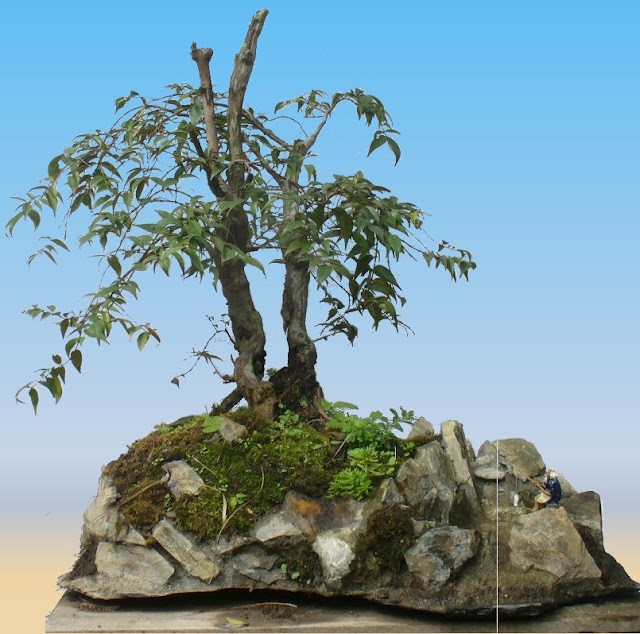 En un principio estos paisajes eran de gran tamaño y estaban confeccionados de diferentes tipos de piedra. Estos arreglos eran muy pesados lo cual los hacía muy difíciles de transportar como por ejemplo, el ejemplar que vemos a continuación, es un Cínaro (Psidium caudatum), estilo doble tronco y está sembrado en una gran laja. Piedras calcáreas están situadas en los bordes de la piedra formando un muro le dan soporte al arbolito. Aclaro que estas fotos también están publicadas en nuestro blog “Samarkanda bonsái”: