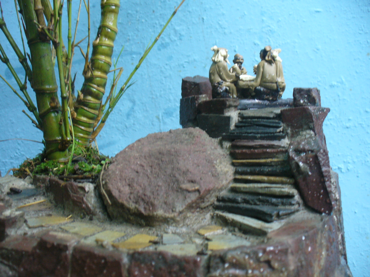 La siguiente pieza representa un camino en medio de un bosque de bambú que atraviesa una quebrada mediante un hermoso puente de cerámica. El camino culmina en una especie de torrecilla donde un grupo de sabios ancianos están reunidos