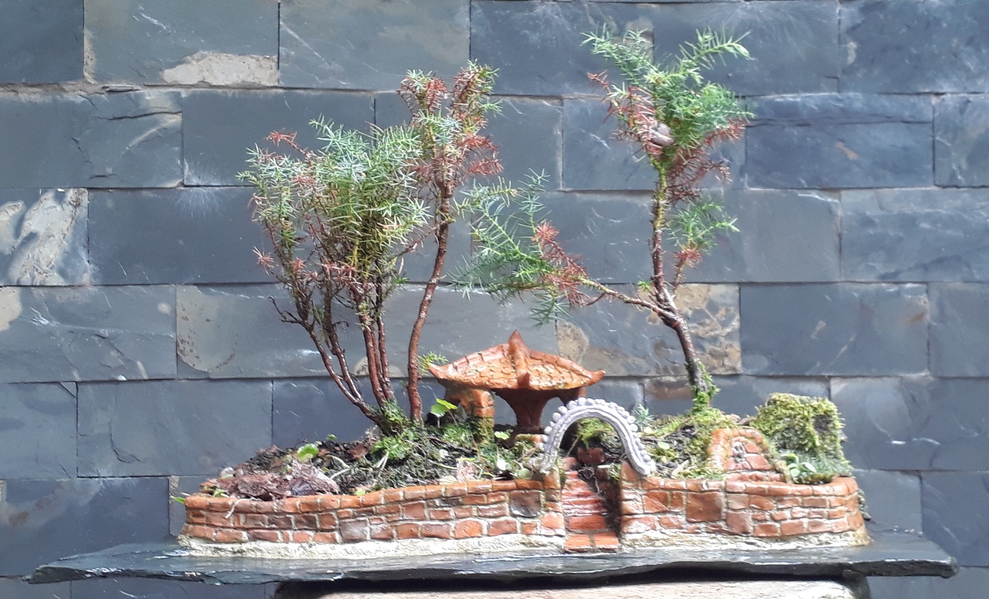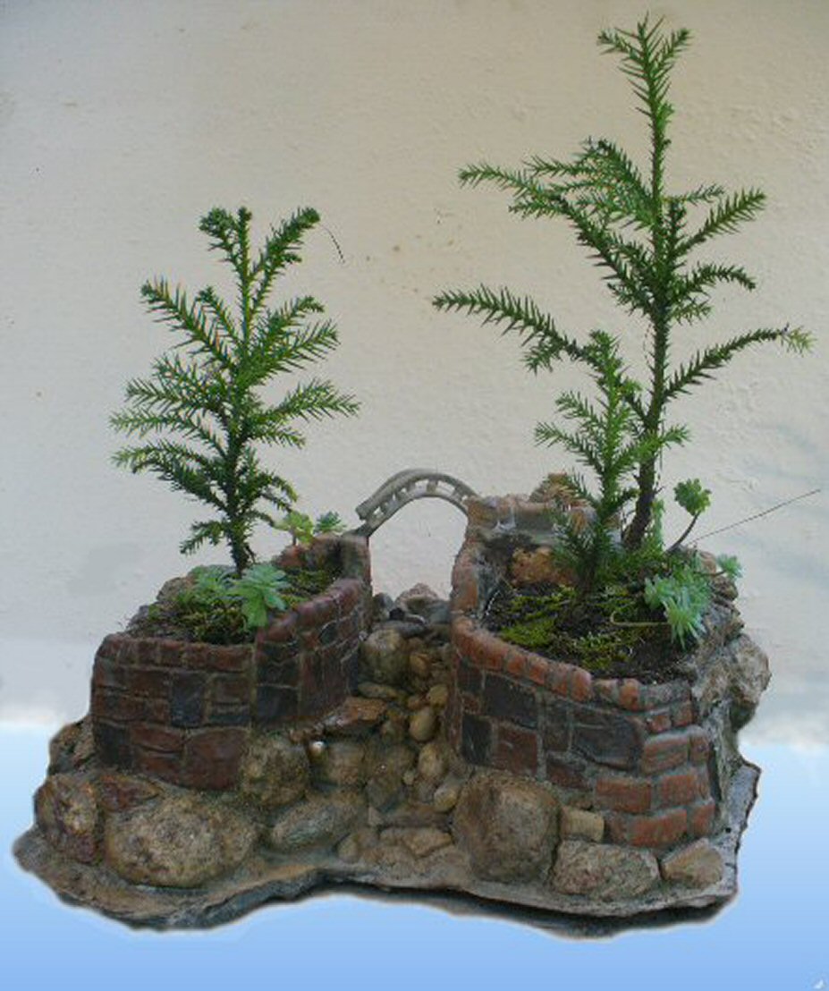 La siguiente fotografía nos presenta un bello jardín con Cedros del Japón (Criptomeria japonica). En esta ocasión fue añadido un puentecillo de cerámica hacho por mi hija y unas paredes de cerámica tallada con formas de piedra. En esta época empezamos a incorporar elementos cerámicos a los microambientes realizados. Fueron utilizadas piezas de cerámica previamente elaboradas y quemadas aparte, para formar muros y construcciones. Estos componentes después fueron pegados con cemento.