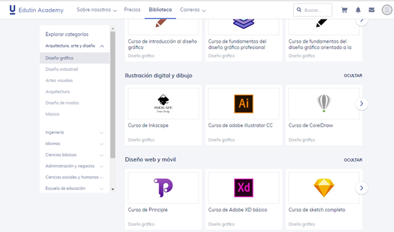 He aquí la Biblioteca de Cursos, donde hallarás 10 categorías y 46 subcategorías para explorar conocimientos que tocan las sutiles líneas de la música y el diseño, y luego escalan los edificios de la ingeniería, pasan por los laboratorios de las ciencias exactas y te dan un recorrido por el cuerpo humano, incluyendo cuidados médicos y personales. Literalmente son cursos para todos, aprende a usar programas como Adobe InDesing y Corel Draw, o empieza desde cero con un curso de Fundamentos del diseño gráfico. Luego, si quieres mejorar la comunicación en tu círculo social, quizás un curso de Comunicación y Habilidades Sociales pueda darte las herramientas necesarias.