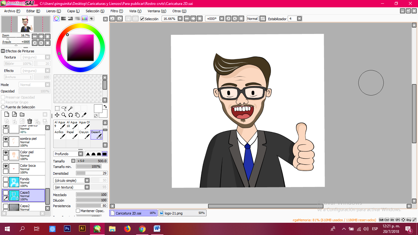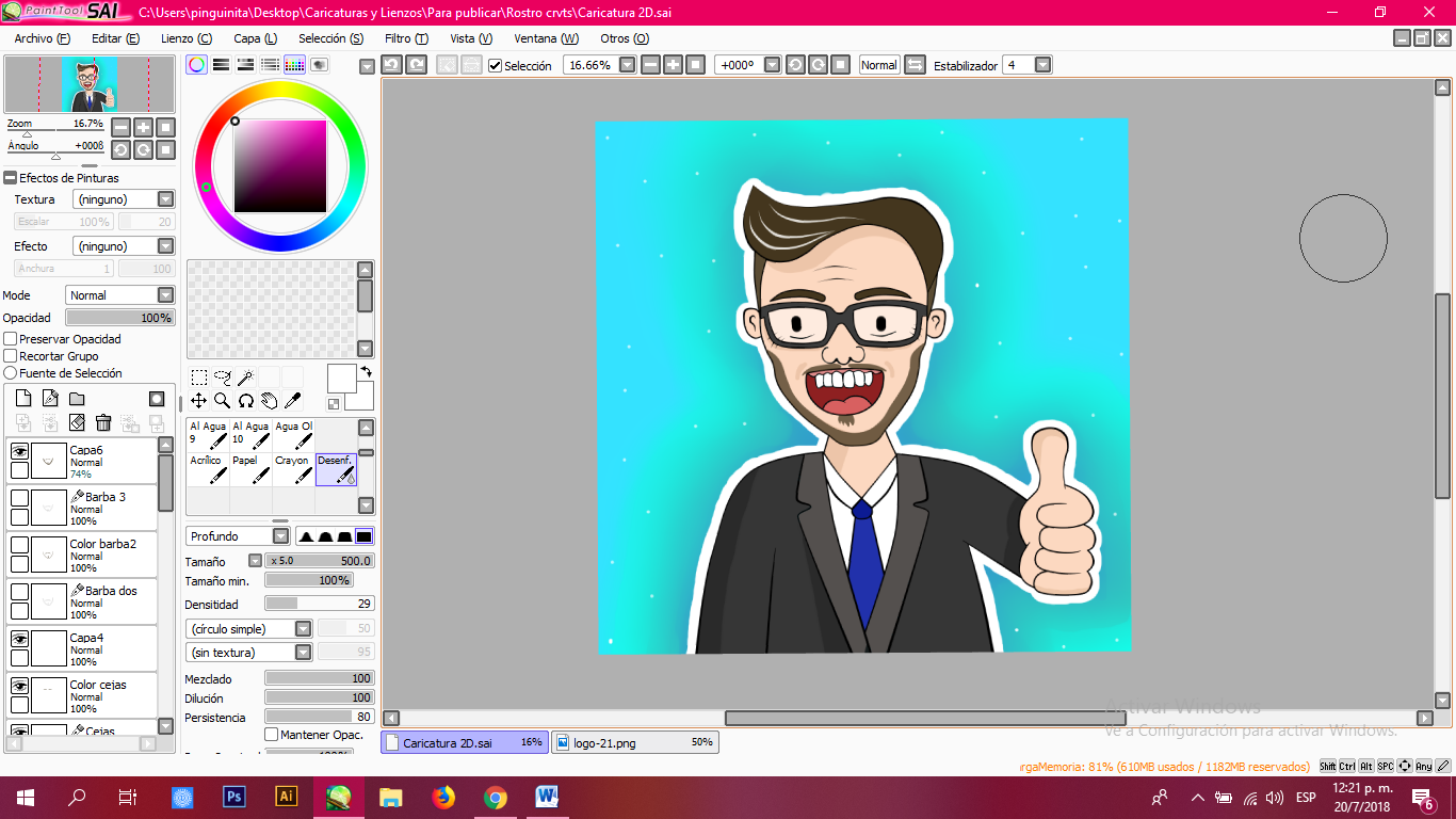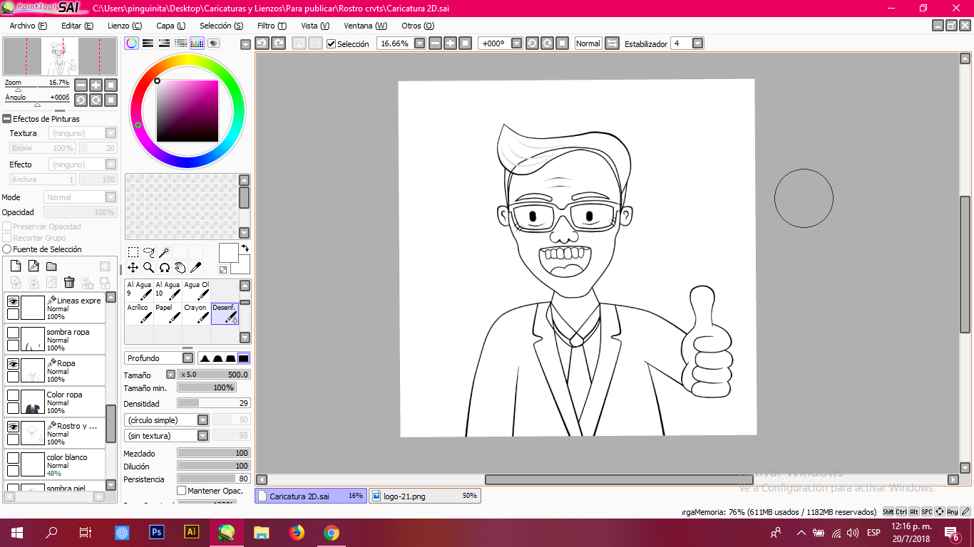 Una vez terminados los trazos que serán base de mi caricatura, proceso a dar color, sombras y algunos detalles que reflejen los rasgos de @pgarcgo.