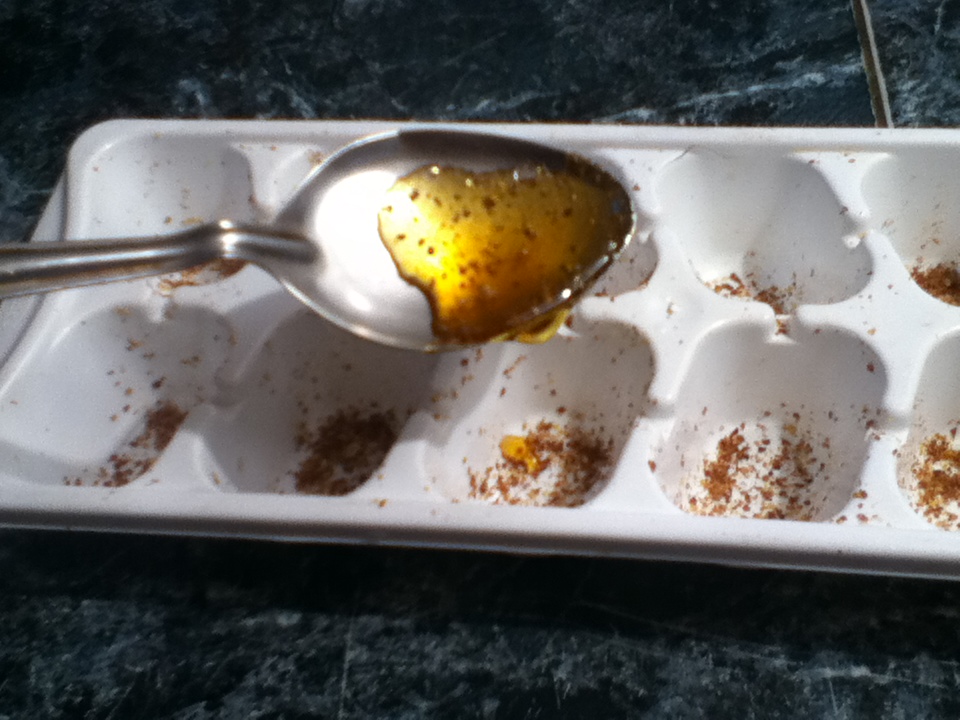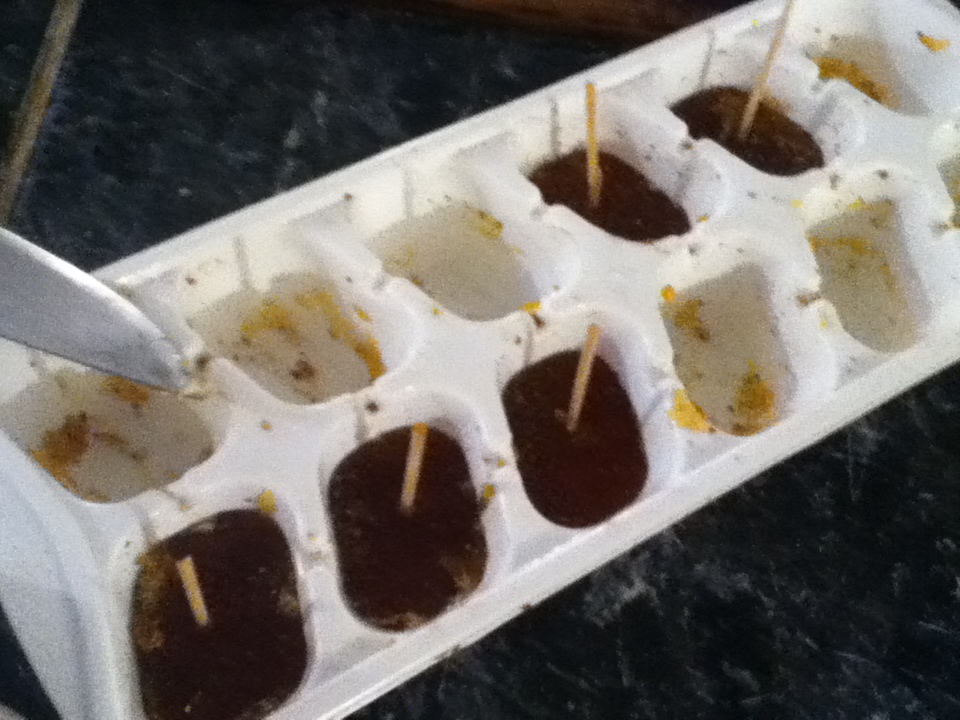 Y le agregamos la linaza, antes de colocar el caramelo le agregamos linaza, con una cuchara lo vamos agregando a la cubeta de hielo.