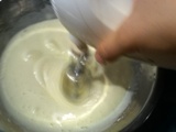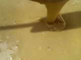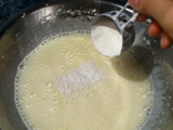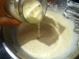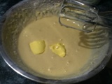- Luego le vamos a ir agregando el jugo de piña poco a poco. Una vez ya agregado todo el jugo le agregamos la harina de trigo (todo uso) y mantequilla.