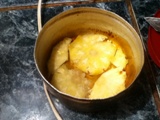 - Comenzamos hacer el caramelo: Agregamos la mitad del azúcar blanca en la olla junto con la mitad del agua a fuego lento hasta obtener un color ligeramente dorado colocar en un molde redondo, donde se distribuyen de forma decorativa las piñas, Batir los 3 huevos junto con el azúcar por 5 minutos hasta que la mezcla se vea cremosa.