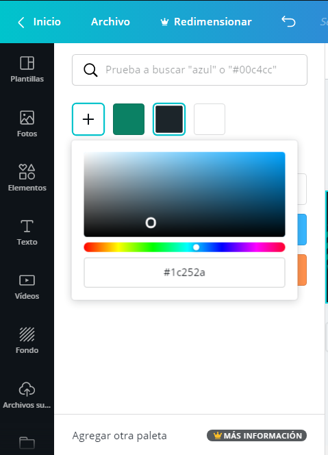 Canvas ofrece la oportunidad de colocar el código de un color e implementarlo en la paleta de opciones.