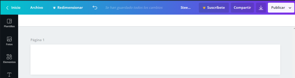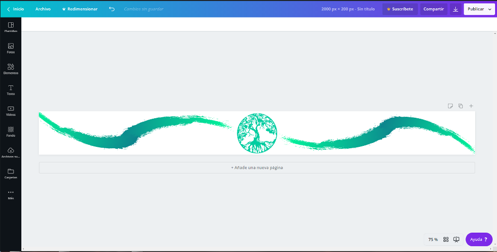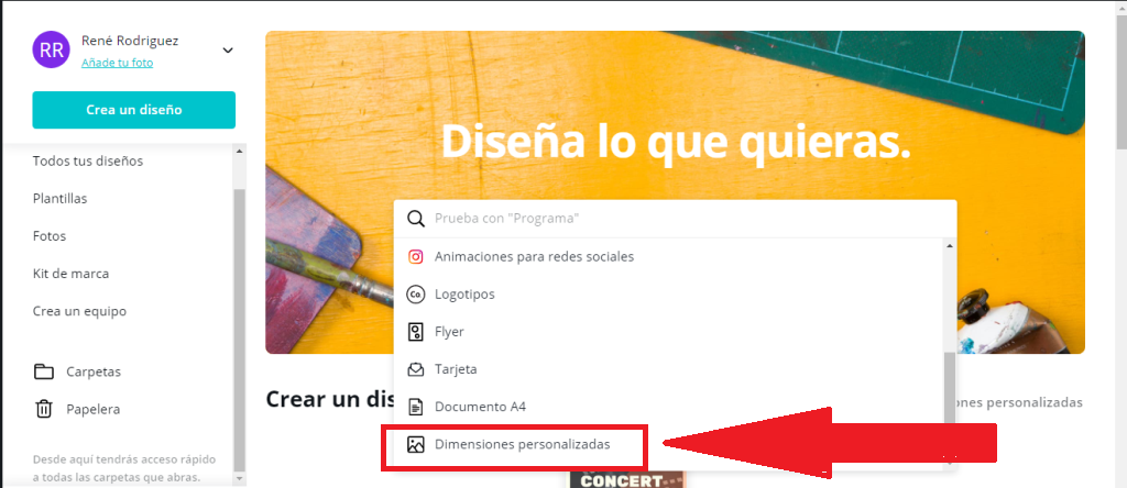 Una vez iniciada la sesión es la barra de selección de diseños elegiremos la ultima que dice: «Dimensiones Personalizadas» y colocamos las siguientes medidas: 2500 px 300 px (estas son las medidas aproximadas para una buena imagen de fondo)