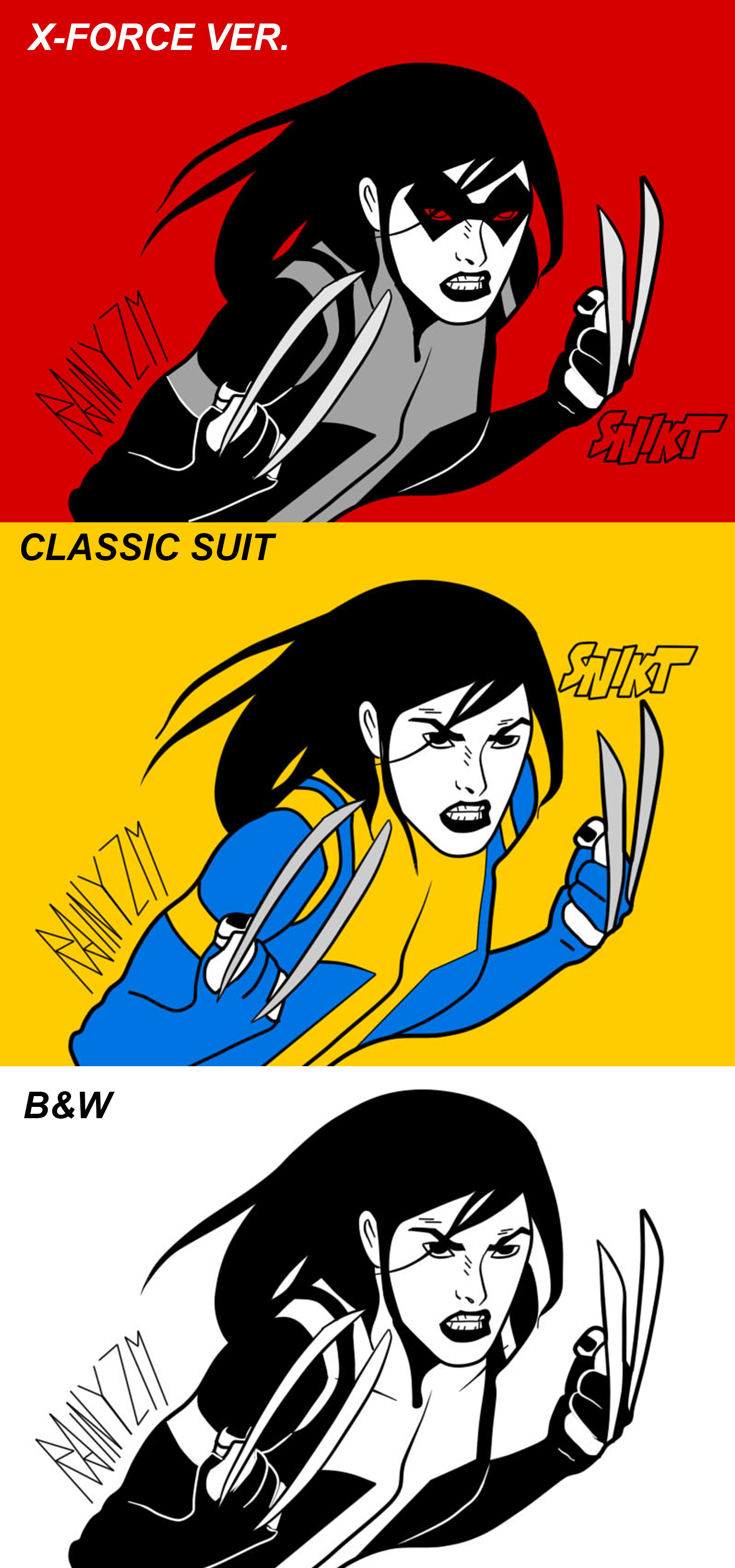 Con la versión de X-23 decidí hacer una reedición de un panel de comic que me gusto demasiado con el traje clásico de wolverine, pero en el proceso de este surgieron varias ideas en el que pude recrearla en todas las versiones de ella que me han agradado manteniendolos en el estilo de line art.