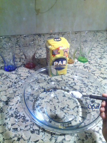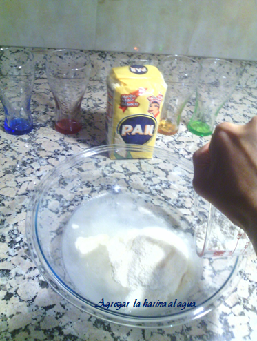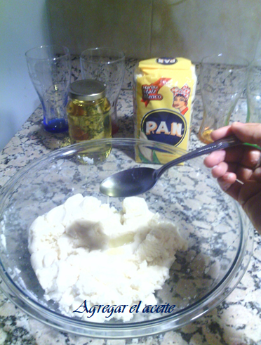 En un bold grande, colocas el agua y la sal, le agregas la harina y vas mezclando con las manos hasta formar una masa, tendrá la consistencia ideal, cuando la masa no se te pegue más de las manos. Sí te parece que esta muy dura, puedes agregarle un poquito más de agua. Luego agregas las tres cucharadas de aceite y listo. A mí me gusta dejarla reposar, no más de 5 minutos.