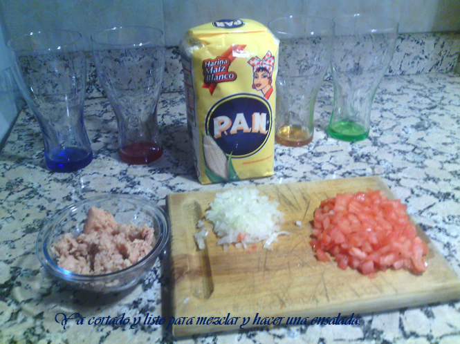 Para mis arepitas prepare una ensalada de tomate, cebolla, atún y queso rallado.