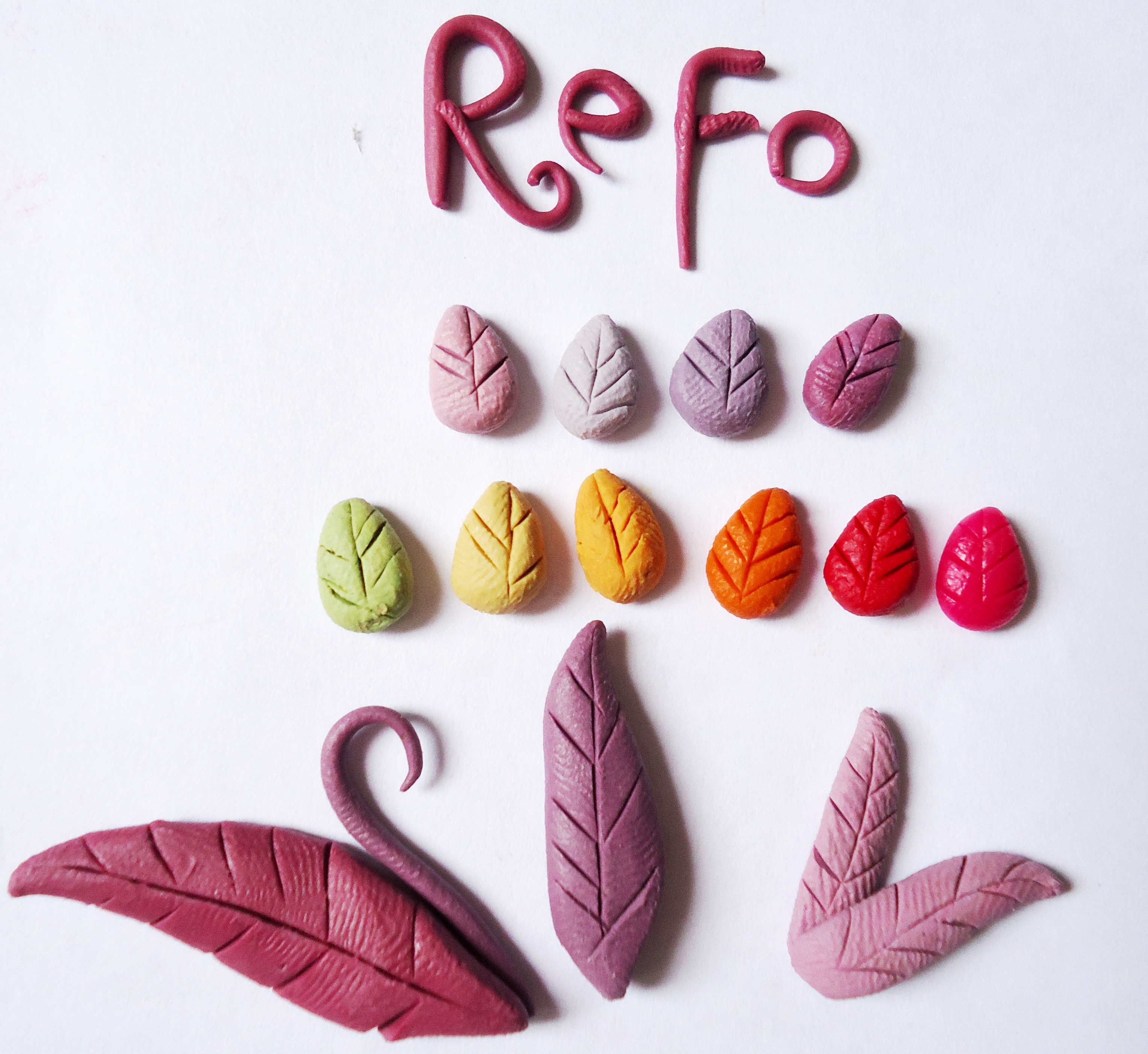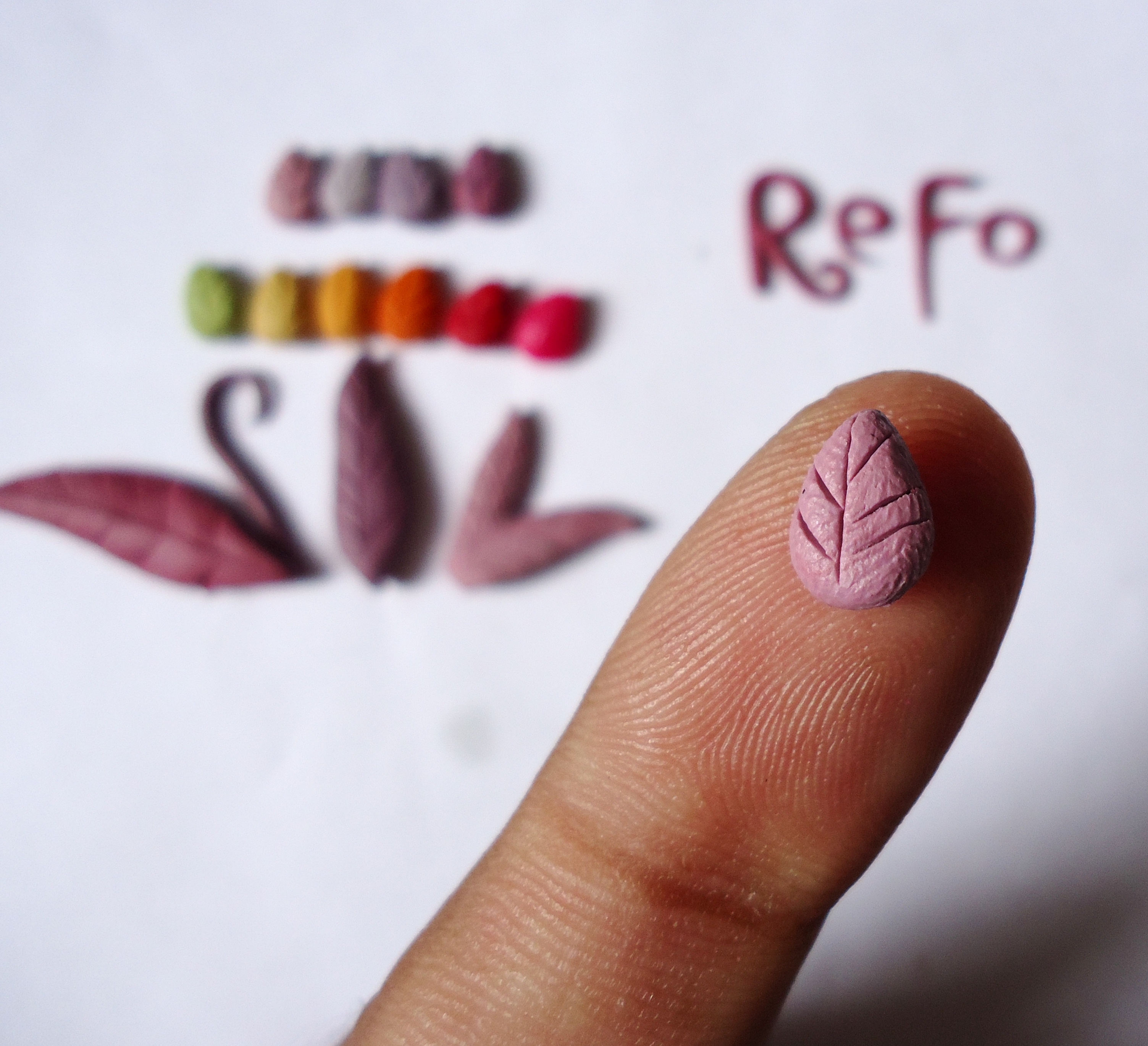 Para la creación de las diversas hojas realicé algunas mezclas de plastilina para obtener tonalidades moradas y violetas, así como varios tipos de amarillos, naranjas y rojos. Las nervaduras o pequeñas líneas de las hojas, las creé haciendo cortes en la plastilina con una esteca metálica.