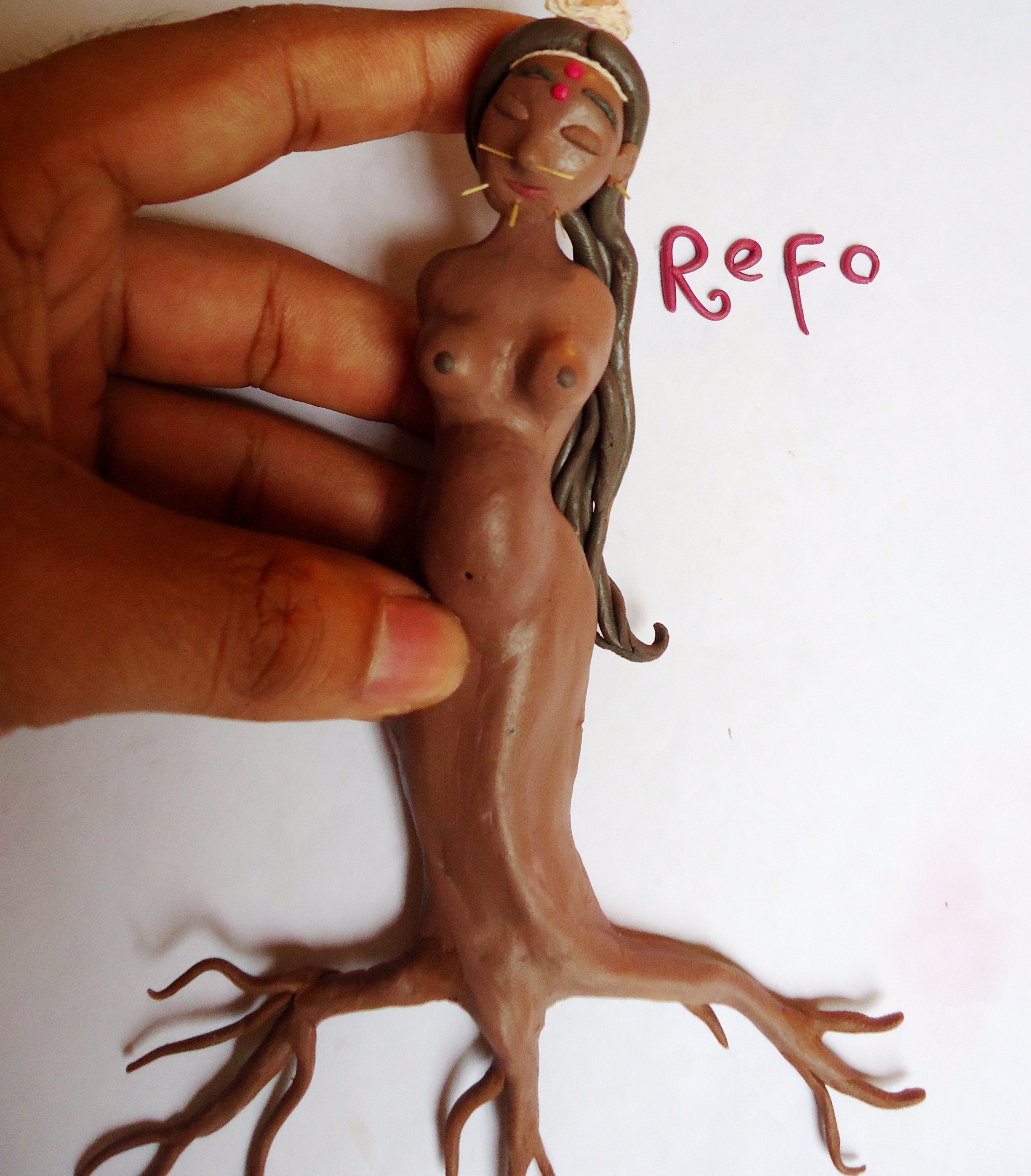 Para el cuerpo de la mujer árbol emplee plastilina marrón, buscando resaltar ese color tostado, tono característico de la piel de todos aborígenes venezolanos, resultado de todos esos siglos de sol que tiñeron maravillosamente sus cuerpos.