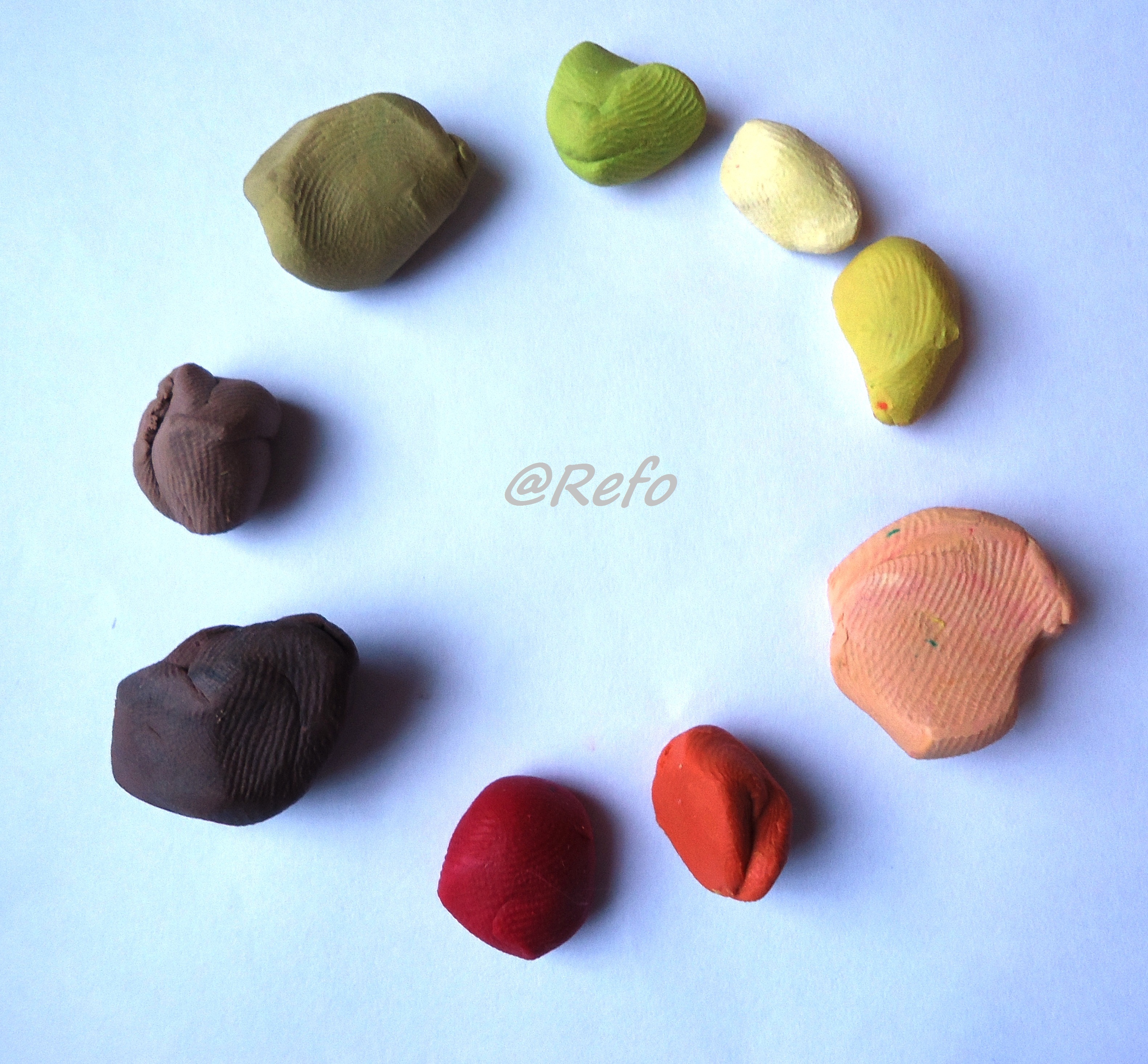 Cuando realizo trabajos en plastilina, por lo general no realizo un boceto previo, siempre voy directamente a la plastilina y empiezo a crear, lo que si preparo con antelación es la paleta de colores con la que voy a trabajar, en el caso de éste trabajo hice una serie de mezclas de plastilina para obtener una serie de colores cálidos, que van desde un blanco amarillento, amarillo limón naranja y rojo, hasta unos tonos marrones sienas y sepia.