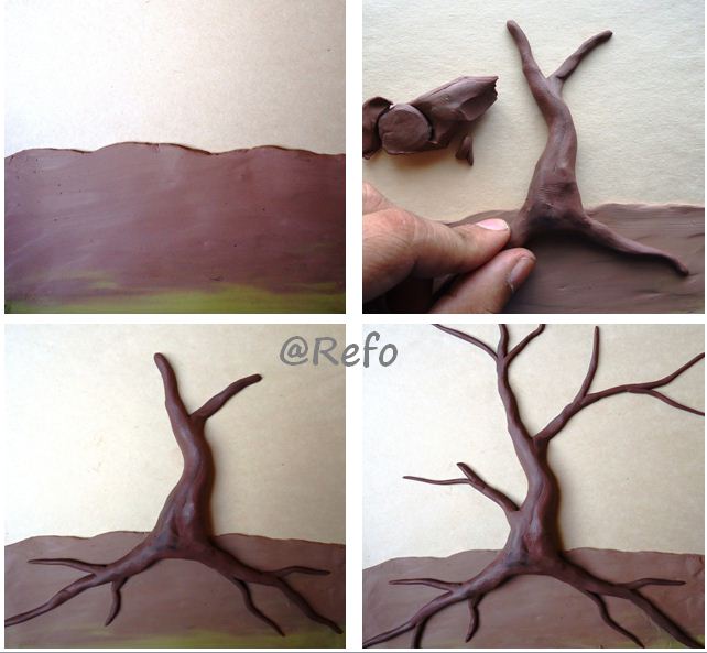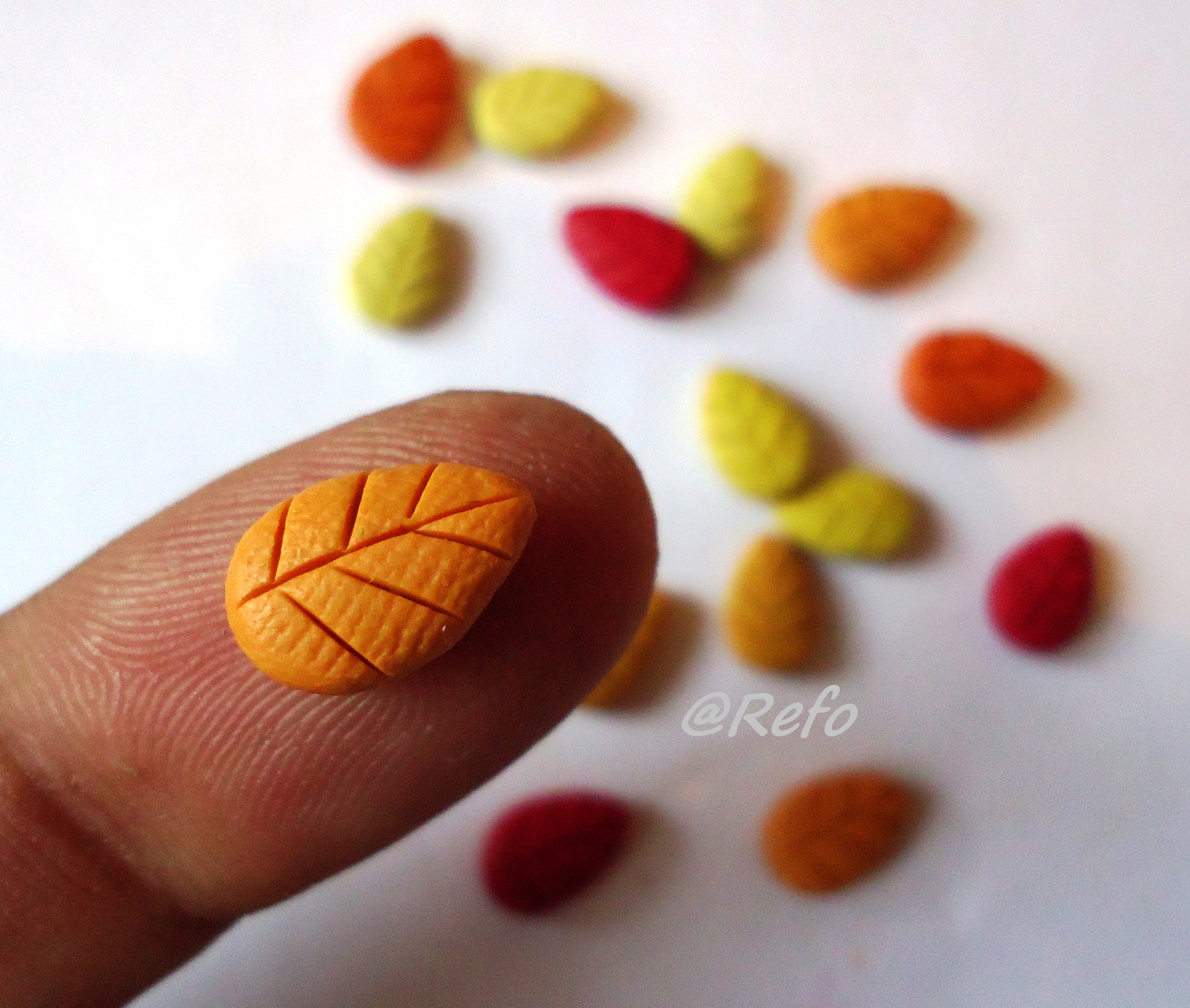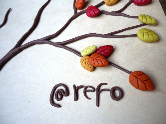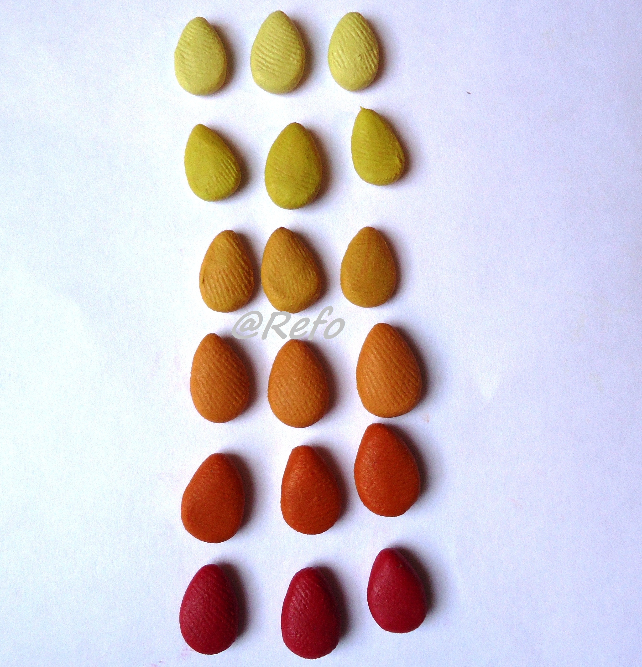 Para las hojas de éste árbol utilice seis tonos diferentes de amarillos, naranjas y rojos, haciendo una especie de conos muy pequeños a los que posteriormente aplastaba con los dedos para crear la forma más básica de hojas.