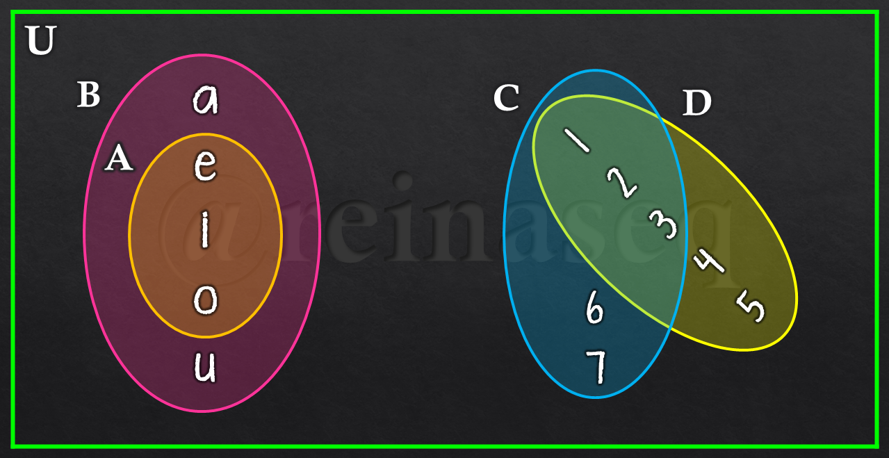 Lo mostrado nos lleva a concluir en primer lugar que A⊂B en tanto que verifica la definición dada, es decir, todo elemento de A pertenece a B. Por otro lado, se puede afirmar que C⊄D, ya que a pesar de que existen elementos en común entre los dos conjuntos existe al menos un elemento que pertenece a C que no se encuentre en D.