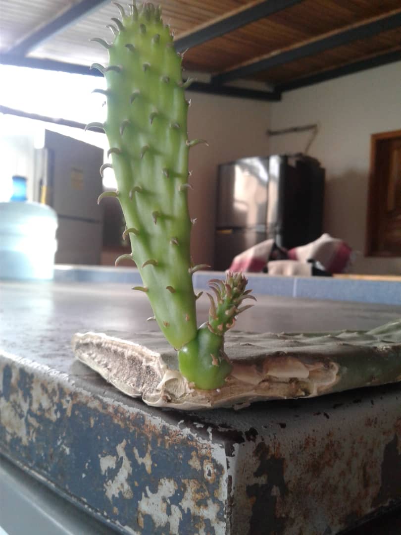 Cuando imagine que ese pequeño tallo de una penca de tuna terminaría en el basurero después de tener meses de cortada, una buena mañana observe como iba reventado un pequeño brote de esta penga exteriormente visiblemente seca, sorpresa la mía la enseñanza de vida que me da esta `planta ya que estaba ubicada cerca de un tanque de agua y que fue cargándose de la frescura que allí emanaba para mantenerse internamente viva y seña de ello el retoño que salió.