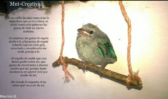 Muy buenas tardes amigos de Mnt-Creativa, feliz tarde, aquí les traigo un hermoso poema espero que les guste, sigamos haciendo poesía.!!! Y me corto las alas como si no le importara que yo no volara, se sintió como si te quitaran las ganas de vivir un nuevo mañana.