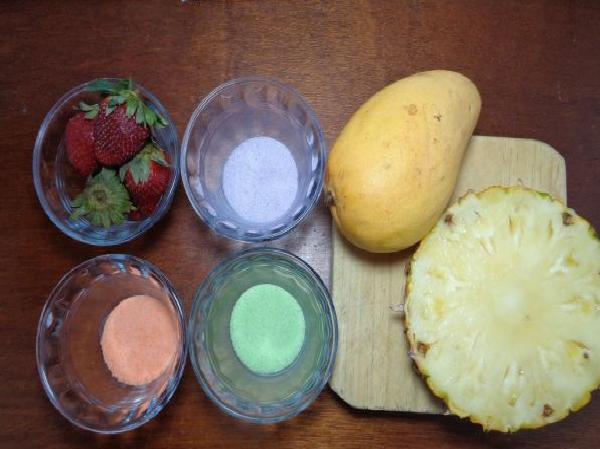 • Como siempre lo primero que hacemos es reunir todos los ingredientes. En este caso puedes usar las frutas y gelatinas del sabor de su preferencia, solo es cuestión de adaptarlo a sus gustos.