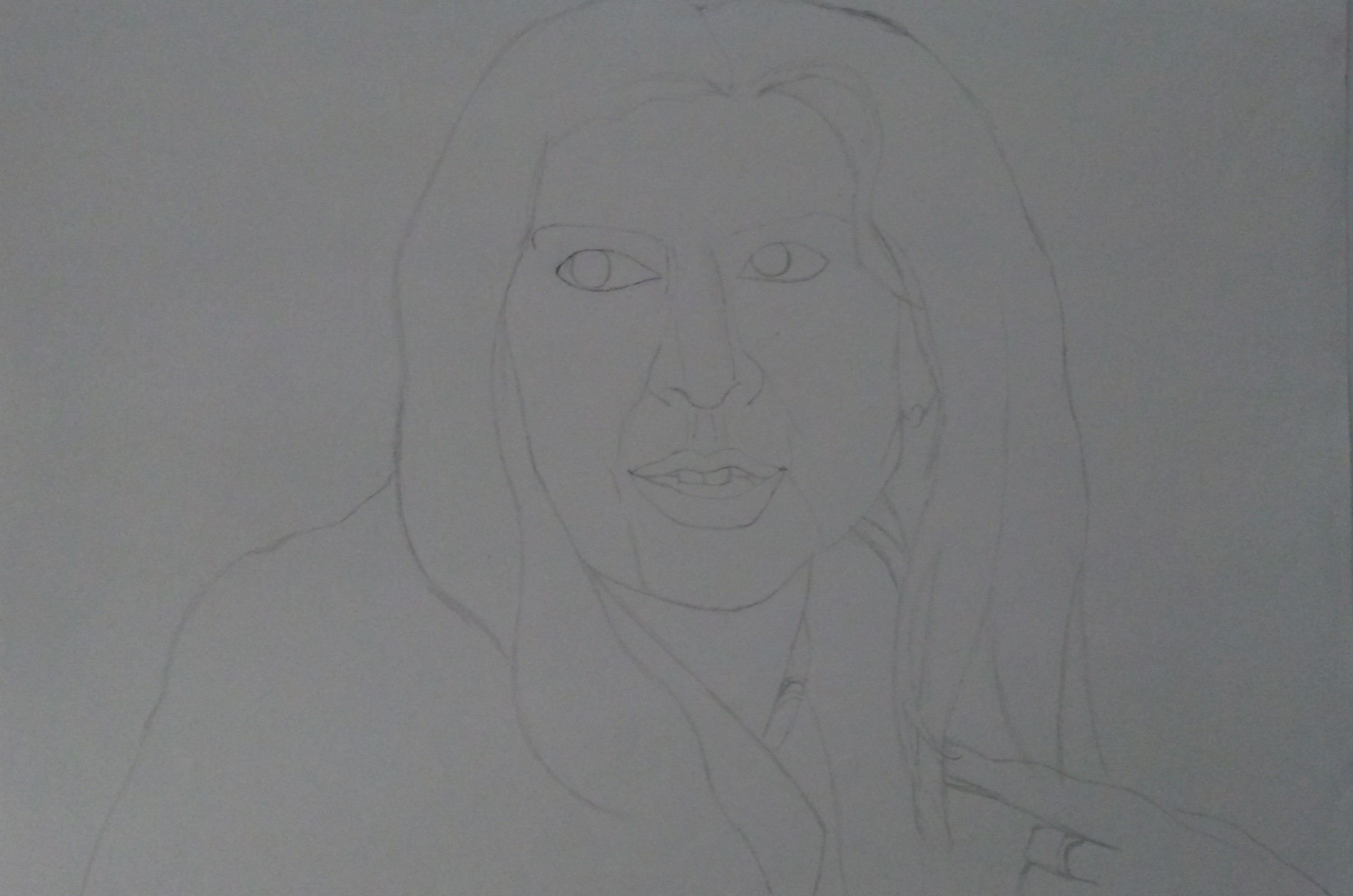 Los materiales usados fueron los habituales para mí: lápices H, 2B, 3B y 4B. El primer paso fue dibujar las líneas exteriores o bordes de la figura con el lápiz H, dando lugar al boceto.