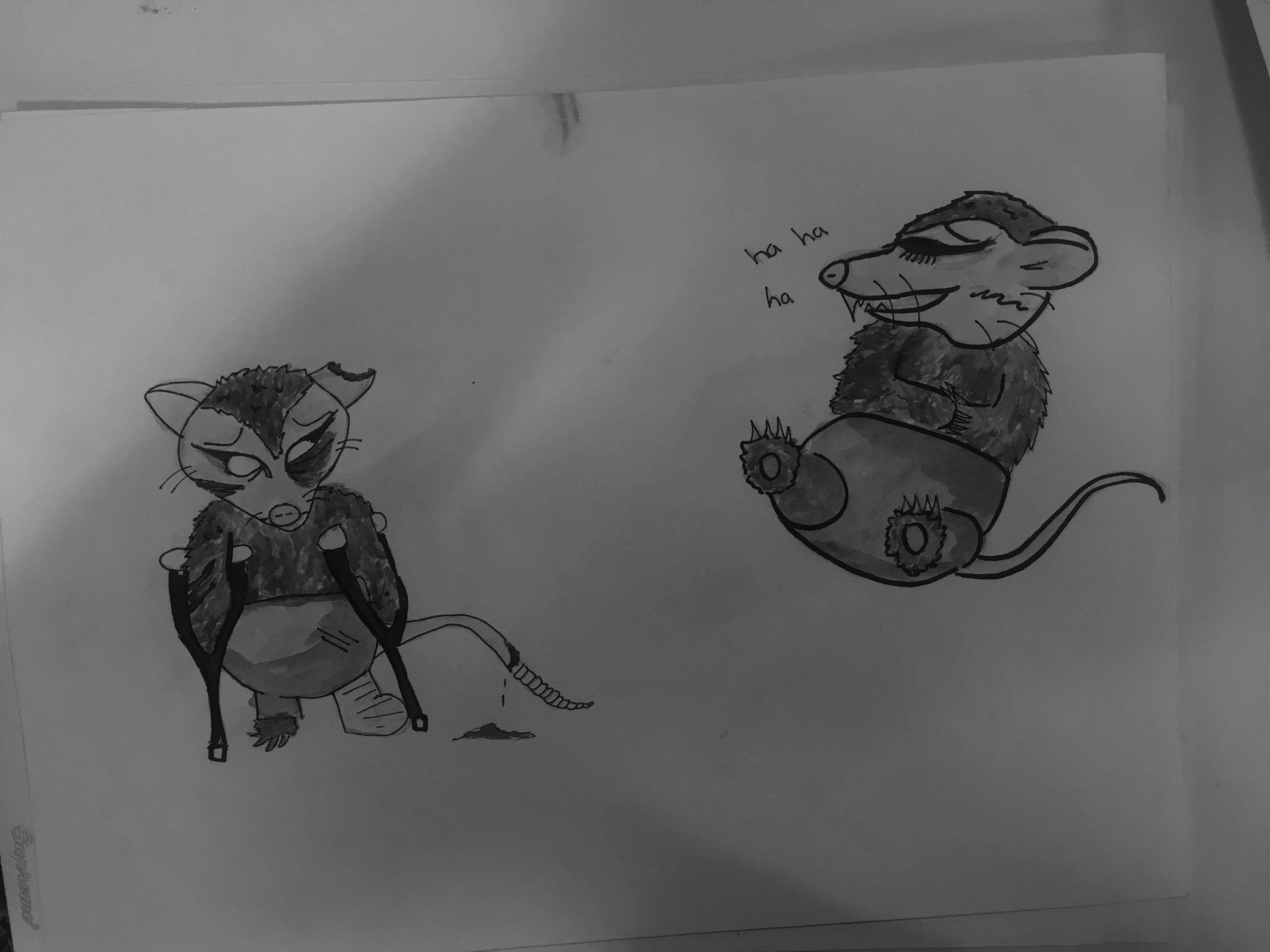 Otra cosa que teníamos que hacer aparte era crear una historia ''graciosa'' entre en crisis porque soy la persona menos graciosa que hay, mi humor es muy raro y bobo, menos mal también nos dio la opción de que fuese una anécdota que nos hubiese pasado y hecho reír en el momento, así que yo la hice sobre un día que fui al cine con unos amigos, varios se quedaron comprando cotufas y se perdieron como los 20 primeros minutos de una película que era el estreno y como 3 minutos después de entrar se les cayo todo lo que habían comprado y fue gracioso para mi, mi plan principal era hacerlo exactamente como paso y los personajes iban a ser mis amigos, yo ya podía imaginar como los iba a hacer y todo... Hasta que al profesor se le ocurrió decir que ahora obligado el personaje de nuestra historia iba a ser el animal que habíamos creado anteriormente (NOOOOOO WHYYYY) PERO SI, tuve que cambiar muchas cosas porque no podía imaginarme animales como si nada en el cine, y de por si no me gusto como quedo mi marsupial ni tampoco hacer animales parados en 2 patas, en fin...