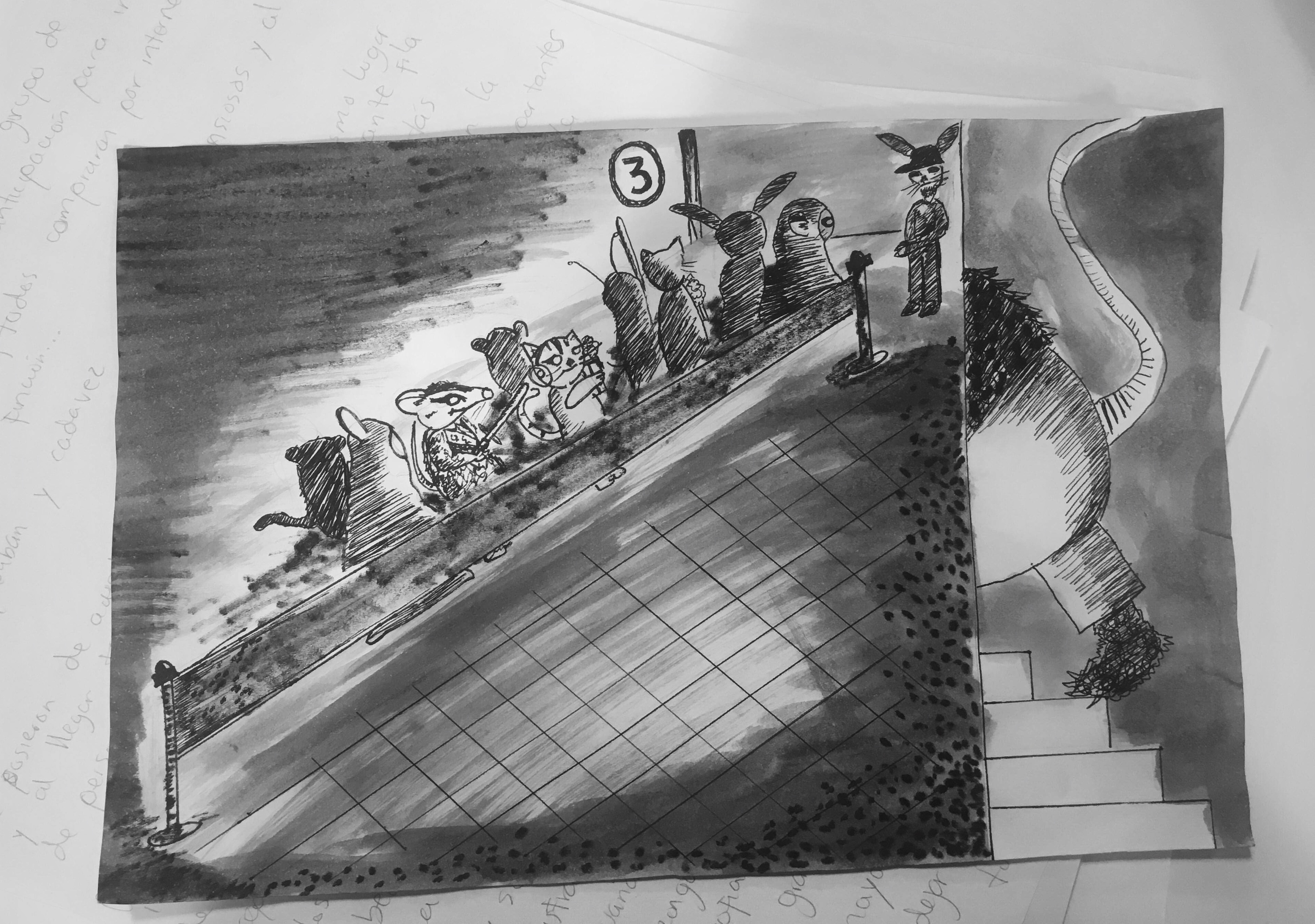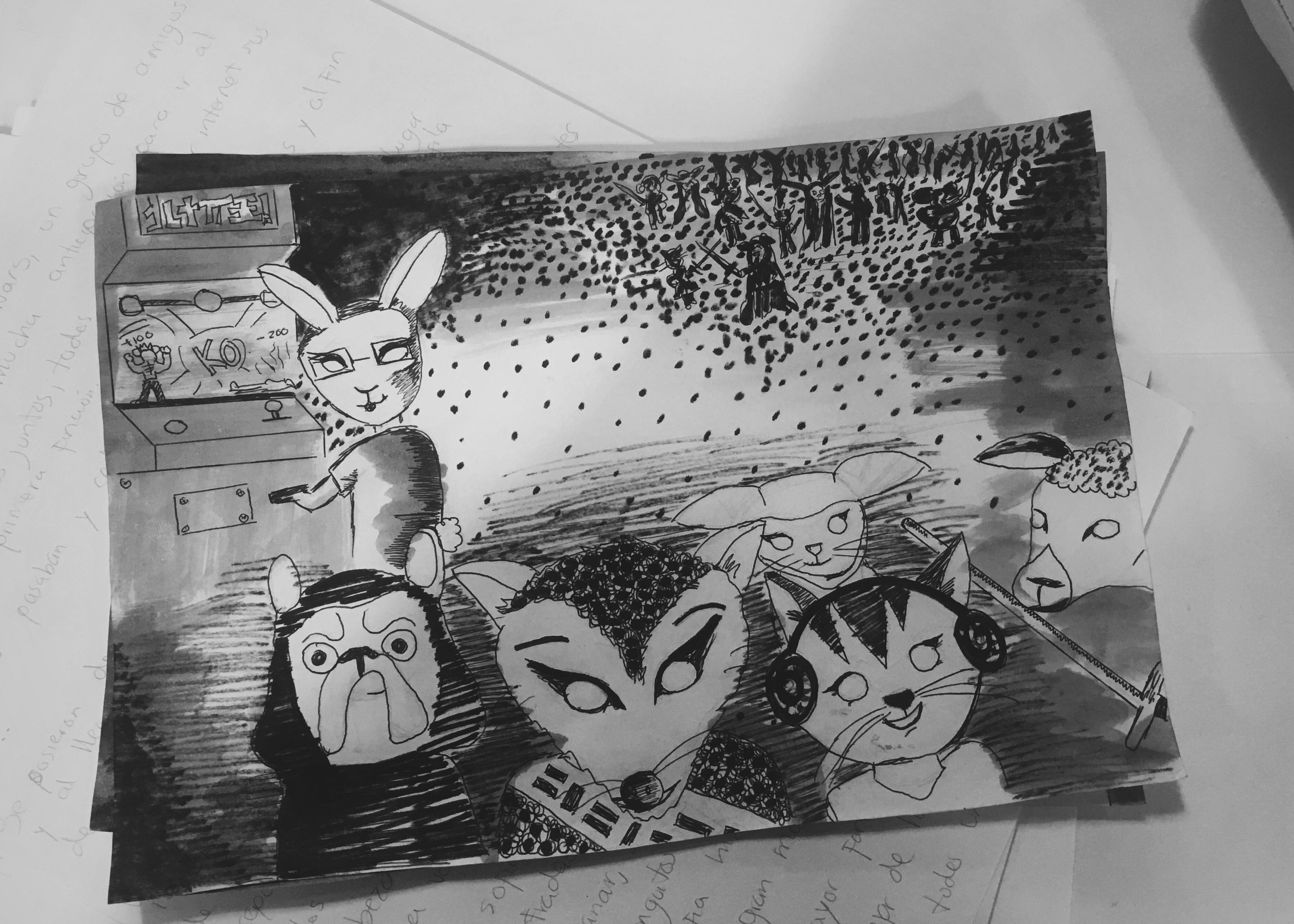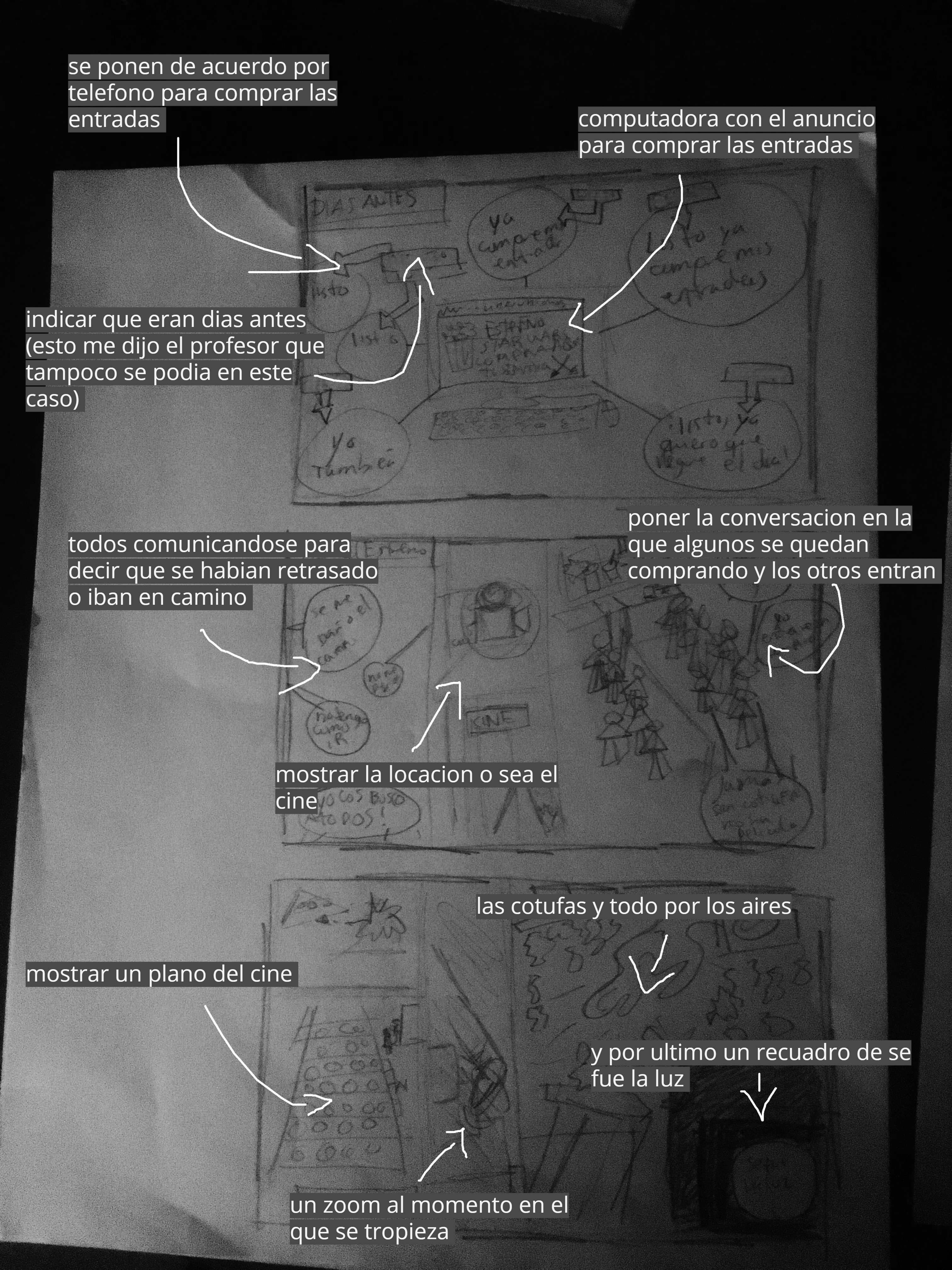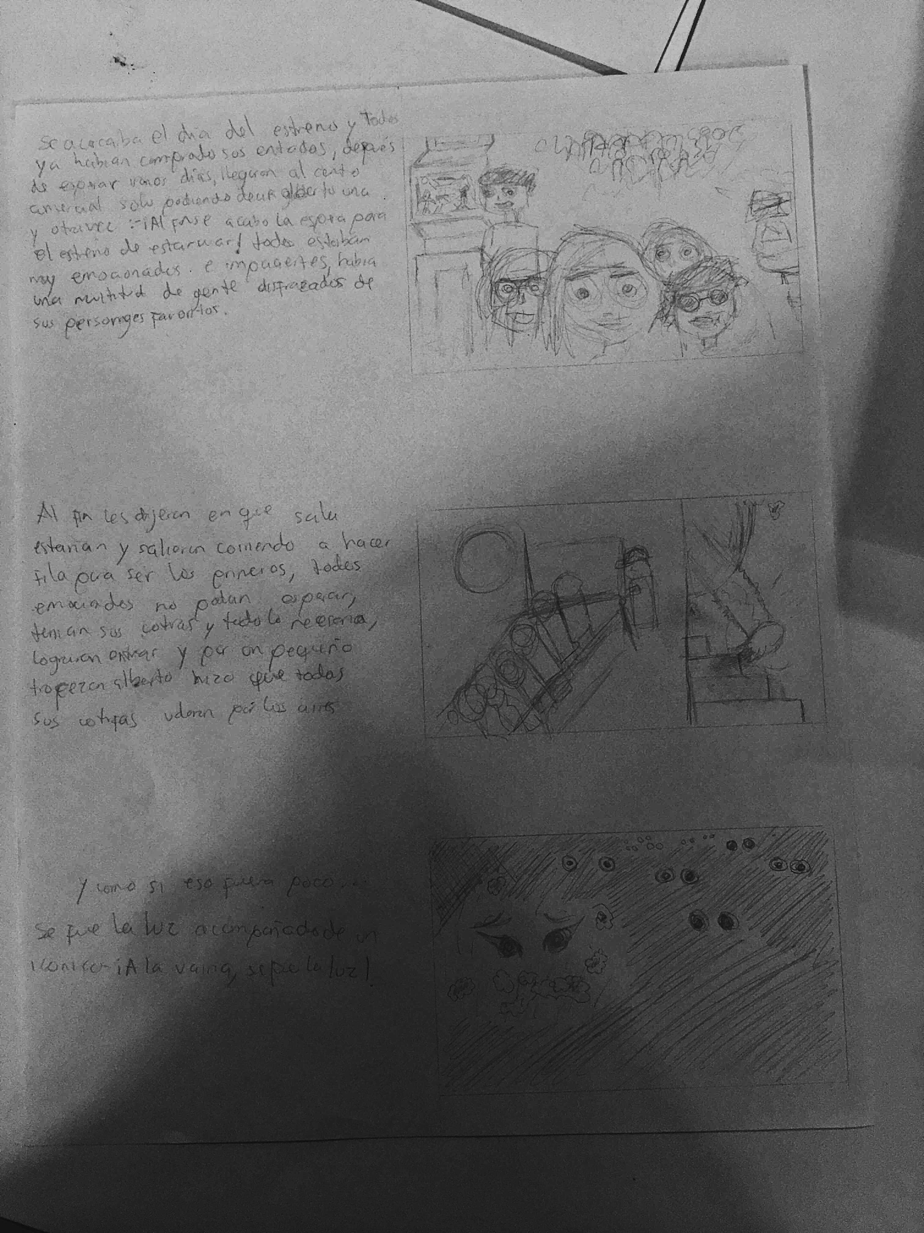 Así que decidí obviar varias cosas y ahora esta era mi idea, se la volví a mostrar al profesor y resultaaaaaaa que en la primer viñeta el quería que se vieran todos los personajes (olvide mencionar que aparte de el protagonista que era el animal que habíamos creado anteriormente debíamos crear a 4 mas para ser parte de la historia) me puso algo triste porque yo tenia muy clara la idea de como quería que fuera la primera viñeta, para mi era bastante original pero bueno, también en la historia que hice quise exagerar un poco la historia poniéndole como final que se fue la luz en el cine pero yo solo lo quería como algo extra y el me dijo que toda la viñeta fuera sobre eso ya que no podía dividir de ninguna forma la ultima viñeta