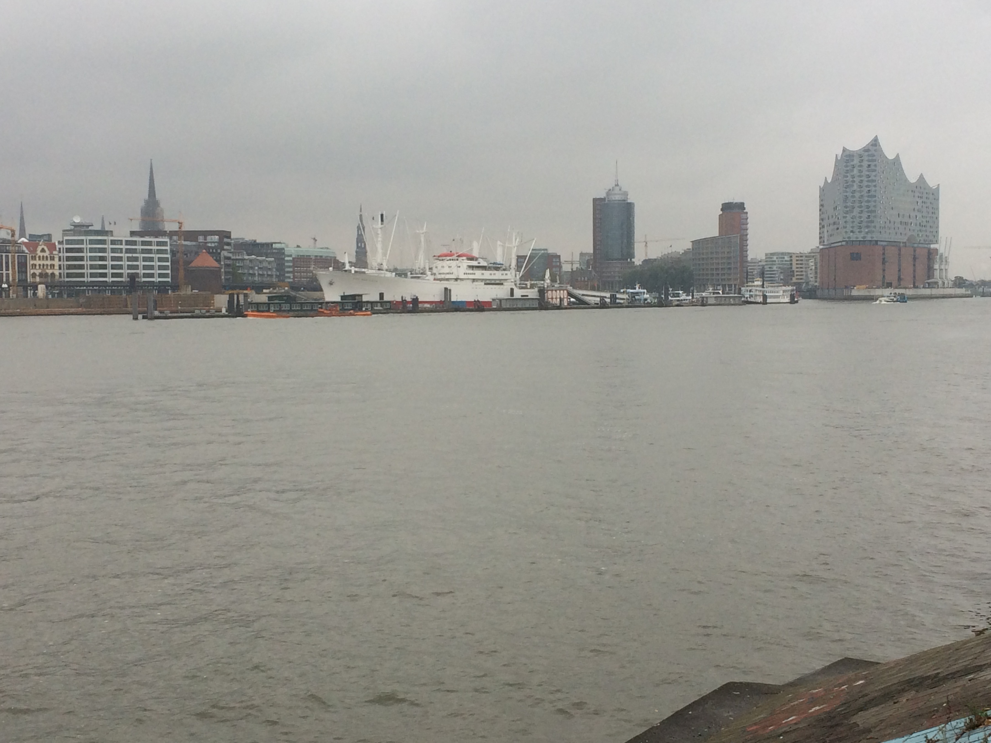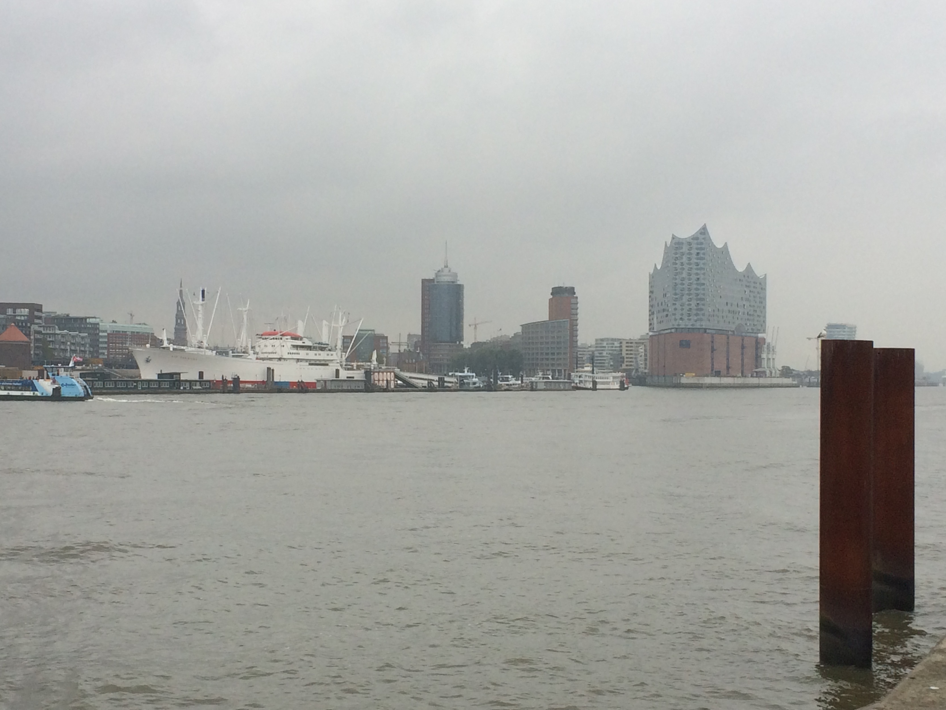 Si se mira a la derecha desde el mirador se puede ver la nueva Elbphilharmonie - el nuevo orgullo de las Hamburguesas. En el fondo de la Elbphilharmonie se puede ver el nuevo distrito Hafencity. Frente a la Elbphilharmonie se encuentran los dos famosos barcos museo Cap San Diego y "Rickmer Rickmers" en el puerto de Hamburgo. Hoy en día, el Cap San Diego es un museo y un barco de eventos, así como un hotel flotante. Con los siguientes enlaces uno puede informarse con mucho gusto más cerca
