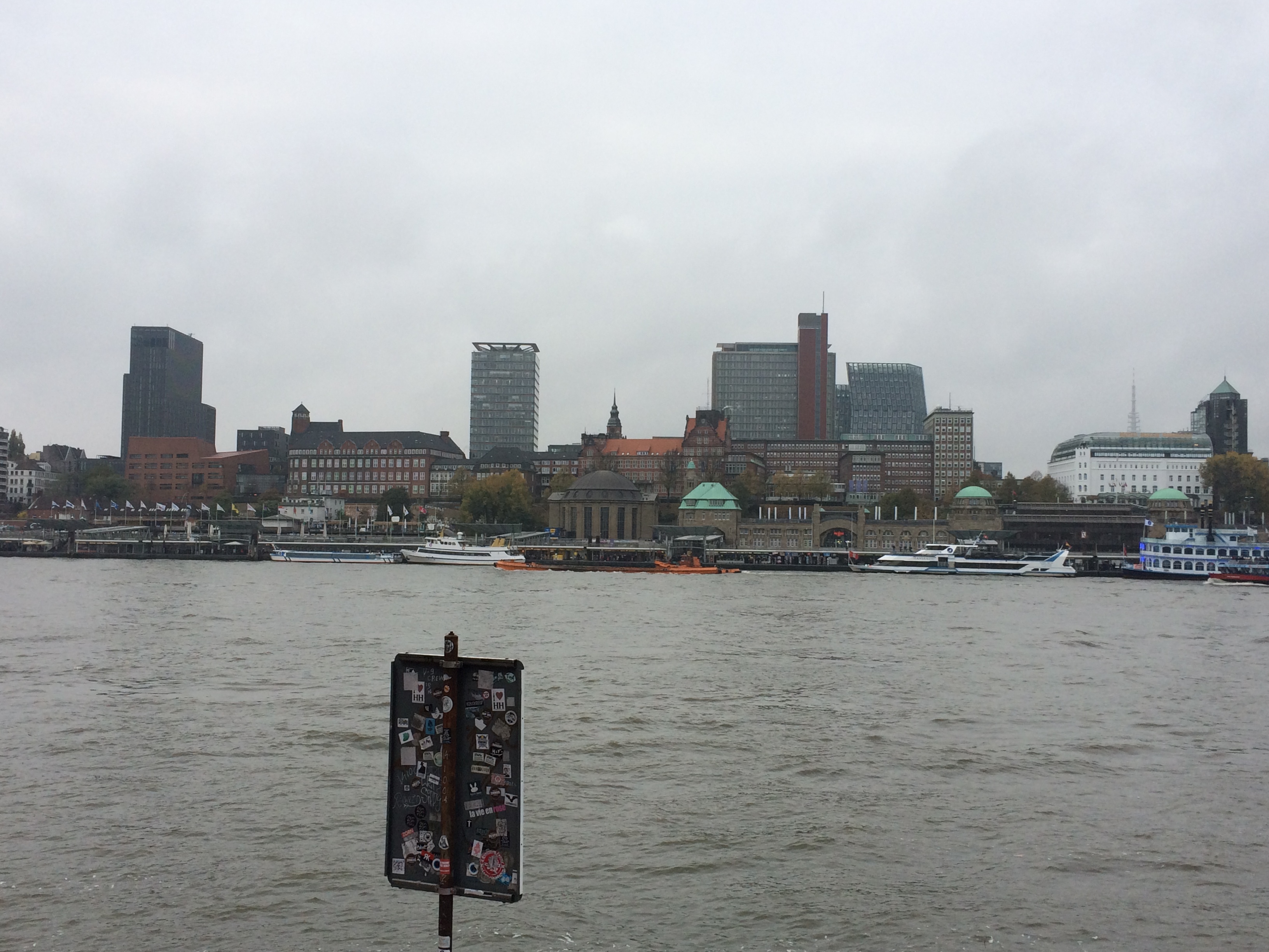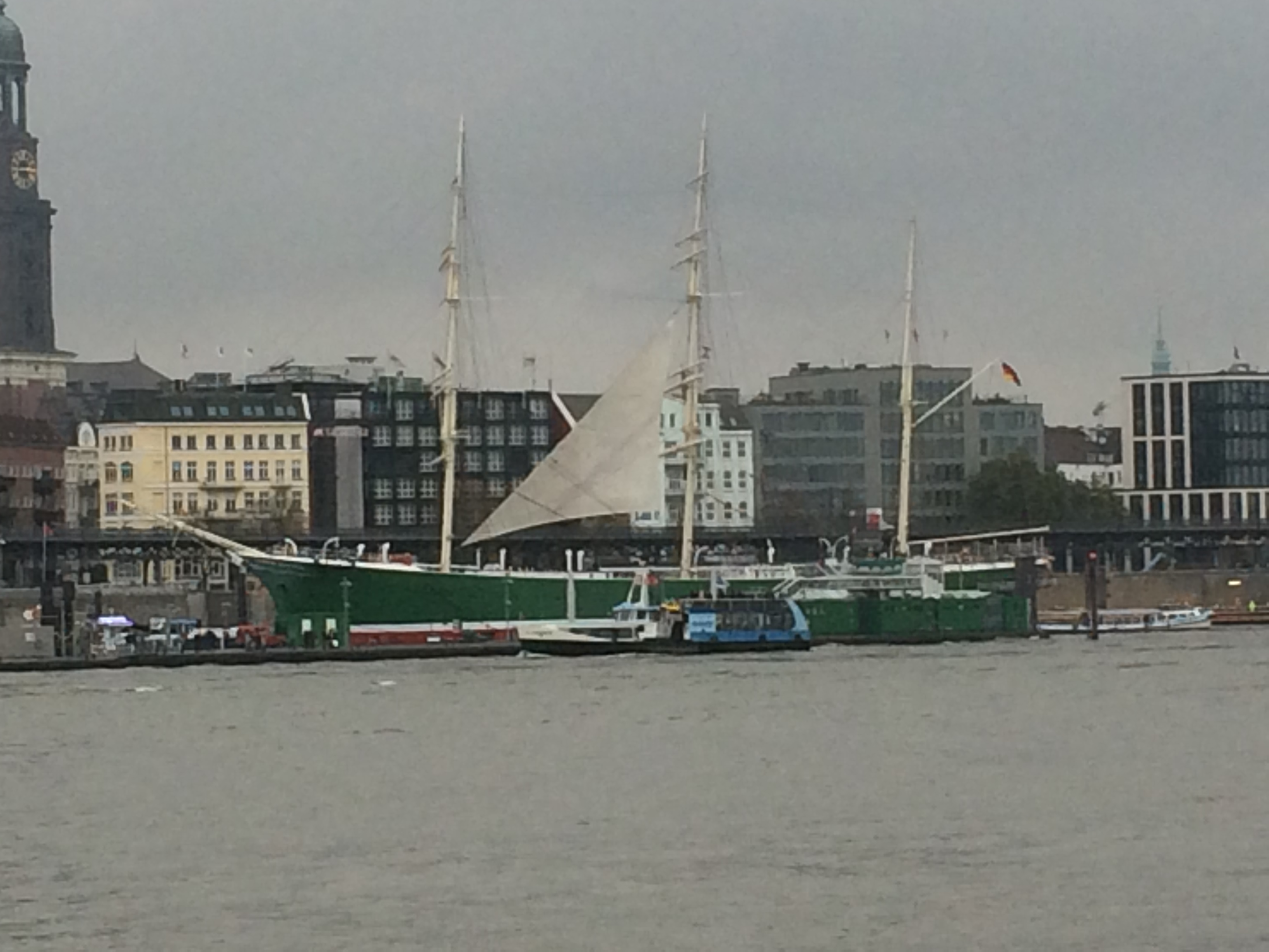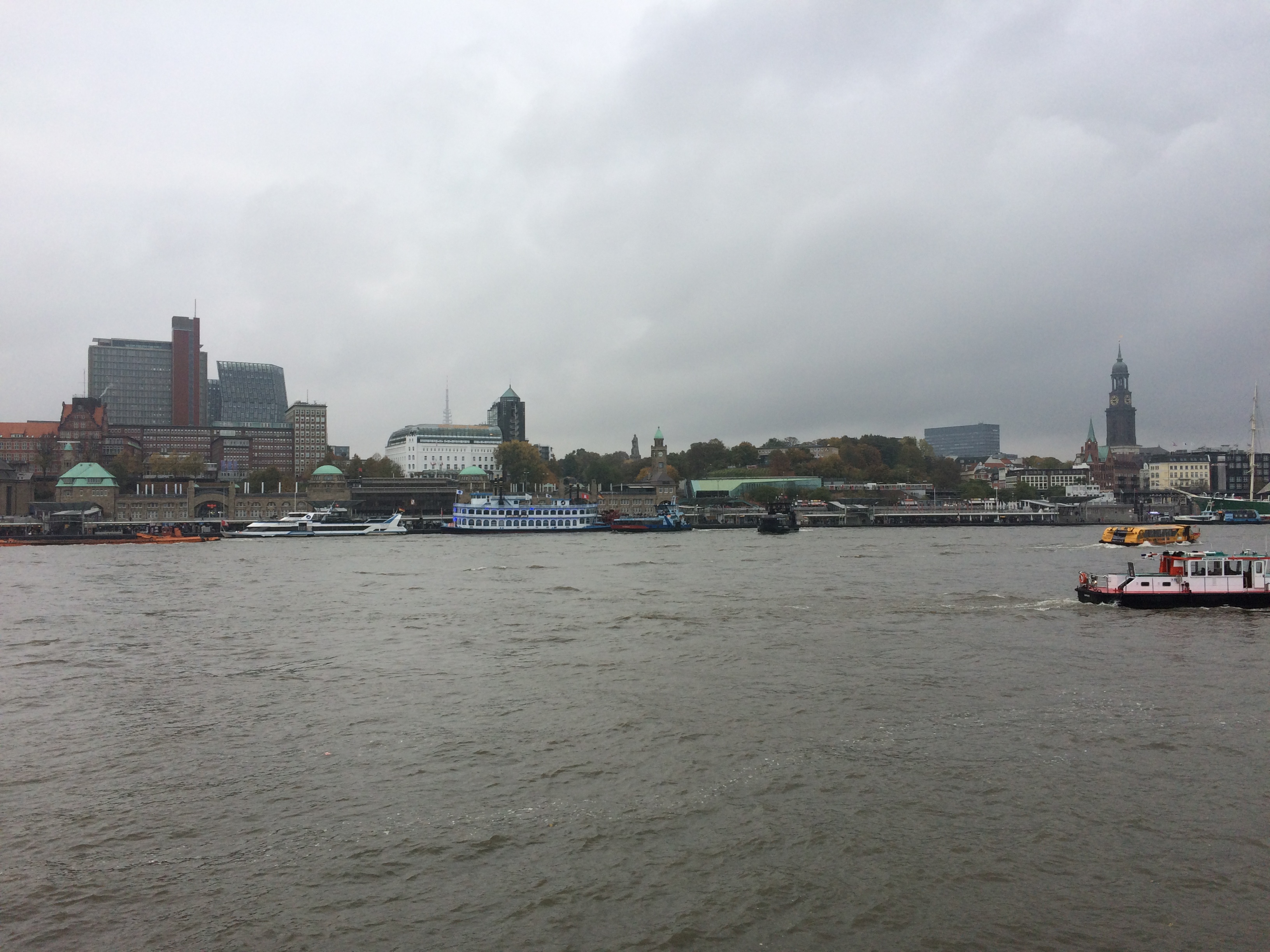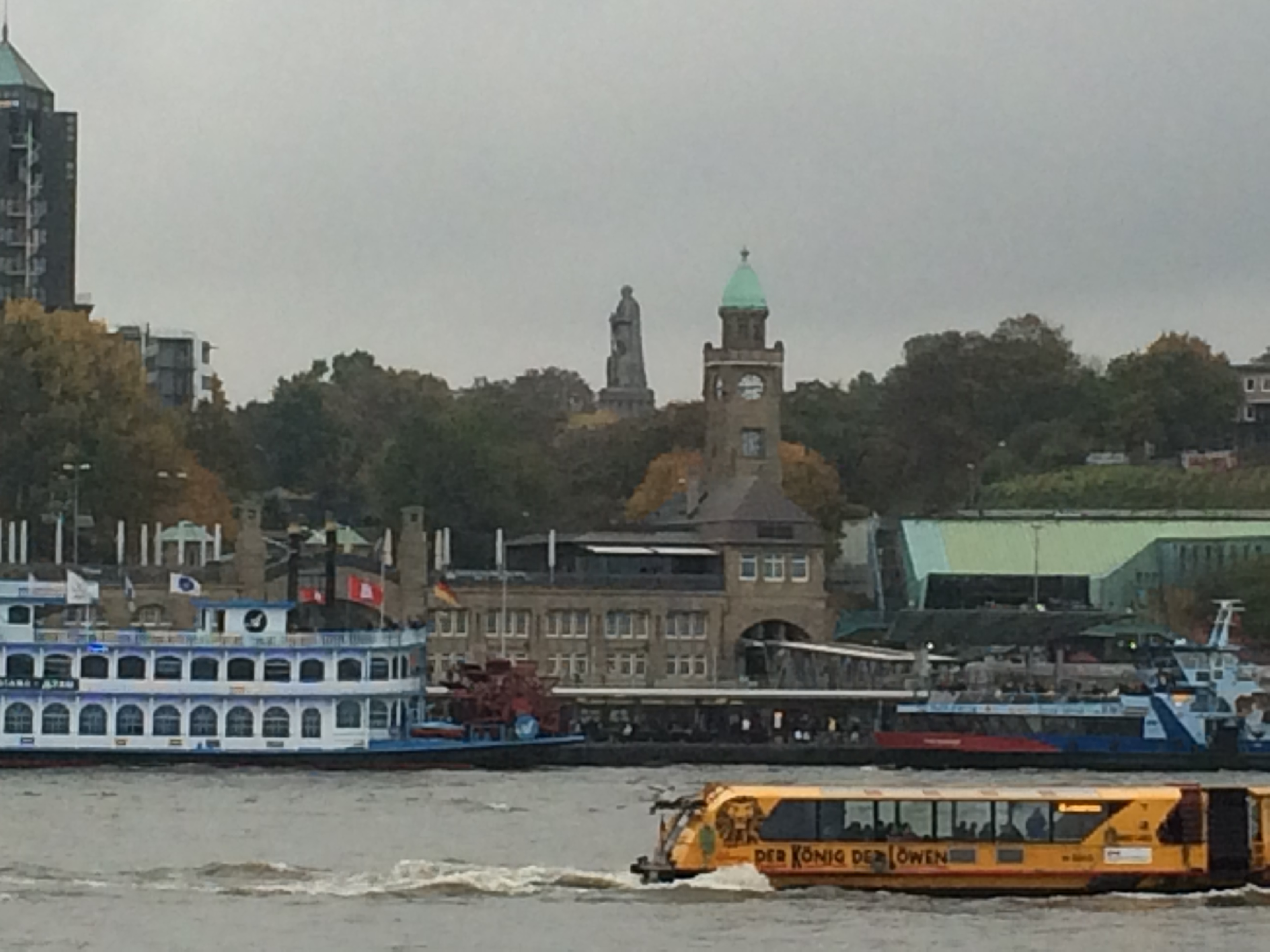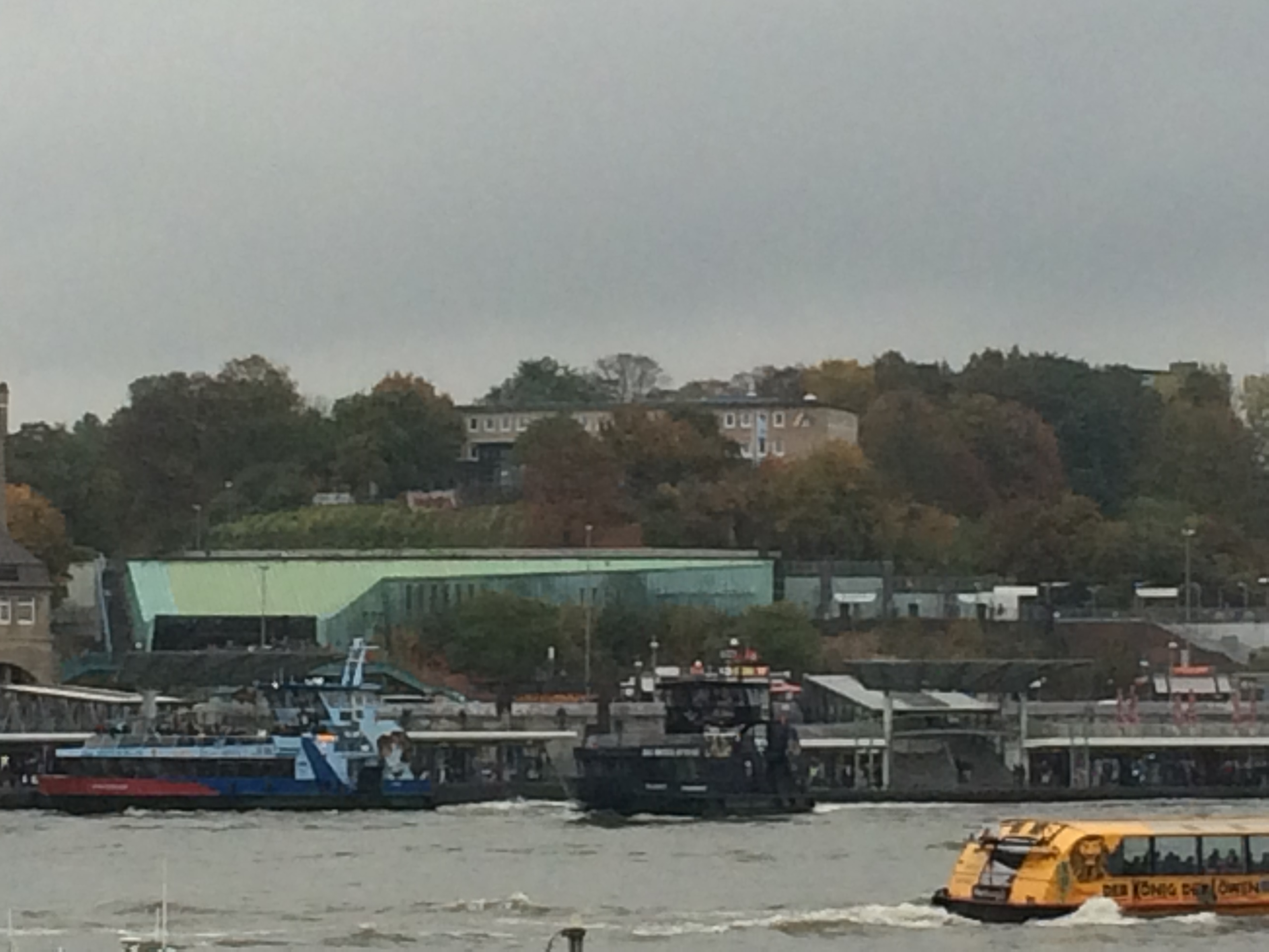 Los barcos que salen del Landungsbrücken y en el fondo el albergue juvenil en el Stintfang.