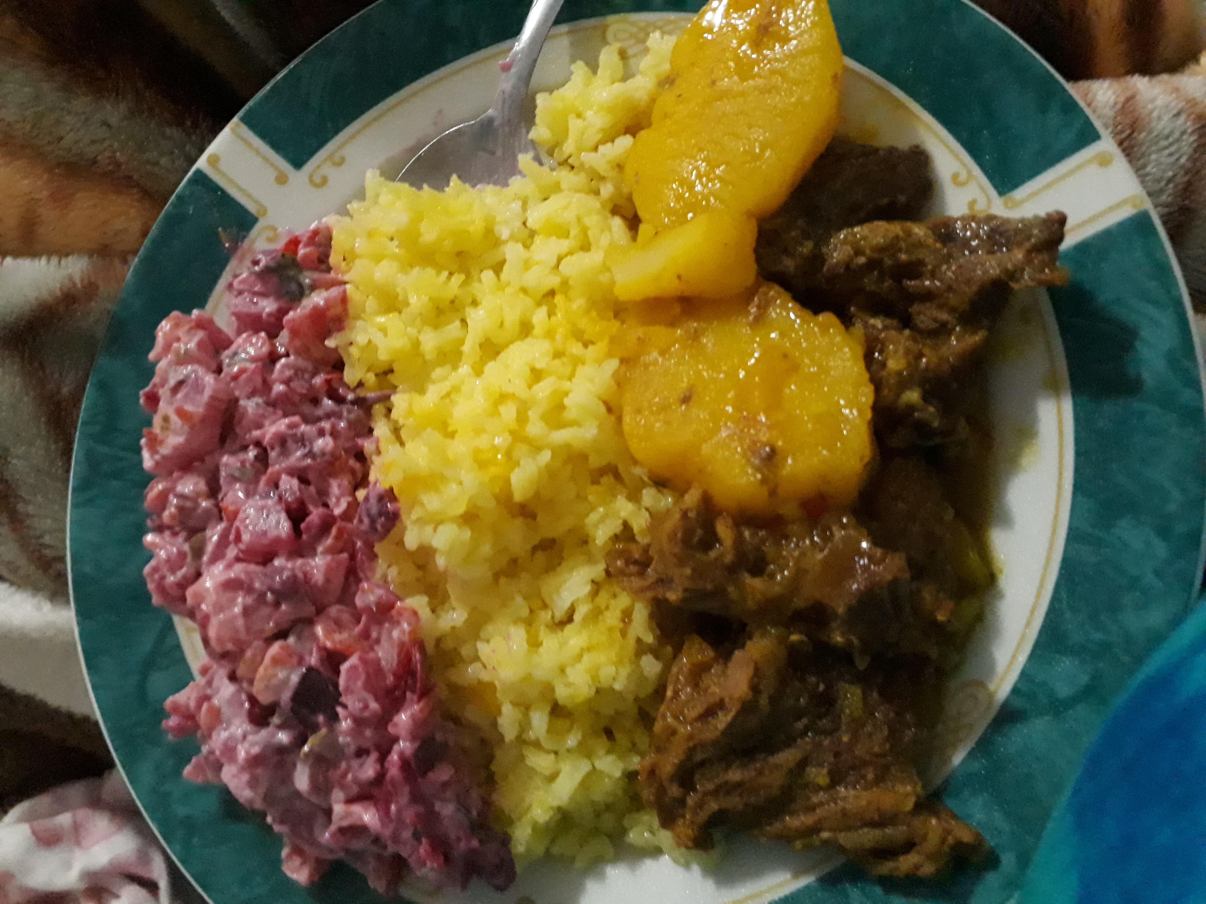 Hoy me toco a mi y como pueden observar hice una rica carne guisada con arroz y ensalada de remolacha