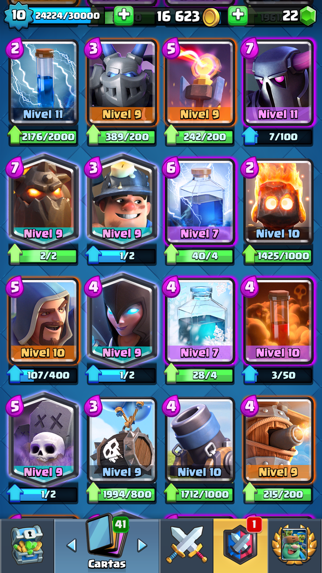 Por lo cual estoy muy emocionada con esta nueva actualización pero me encontré con un bug tremendo que me causo mucha risa es que la mayoría de las cartas están a nivel 9, 10 y 11. Hasta las cartas legendarias y las epicas cosa que nunca pasaría, también cuando juegas las partidas todas las cartas están al máximo, bueno acá les dejo un par de imagenes solo quería compartir este bug con ustedes 😂😂