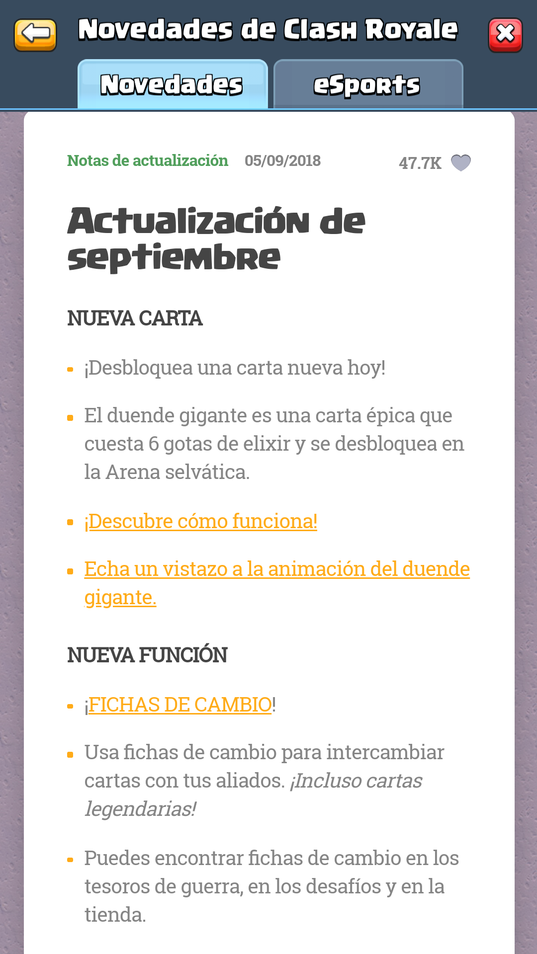 Hola gente hoy salió la nueva actualización de uno de mis juegos favoritos Clash Royale el cual incluía una nueva carta el duende gigante y fichas de cambió acá les dejo una imagen sobre eso: