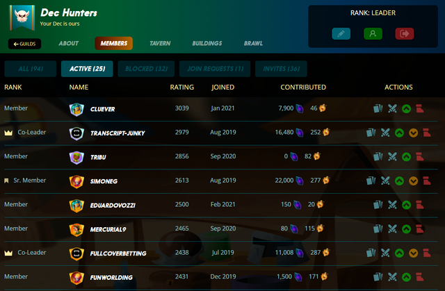 Friendly reminder to Guild members who are not contributing to the Guild that Brawls are a great way to add a contribution to the Guild in the effort to upgrade the arena, I have manually added players to Brawls in the past and they have not participated despite logging on and playing ranked battles. If you don't contribute either DEC or to Brawls you are in danger of being replaced, there are plenty of players wanting to join the Guild.