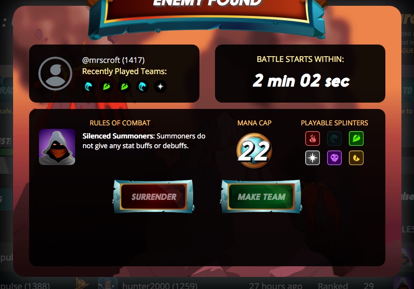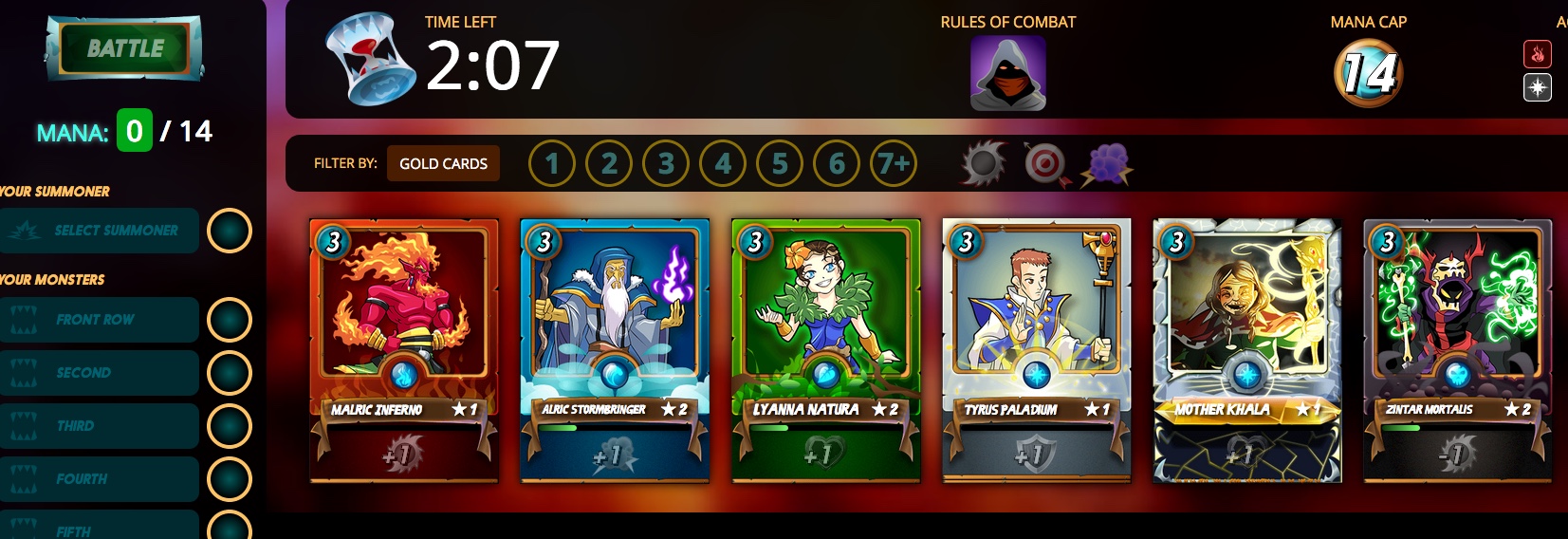 you will see the mana cap, the rules of this battle (rules changes in every battle to make it more interesting, it can be “no healing”, only a special kind of cards, “no armour” and many others). You’ll see also the other user level and the recent cards he was using, just put the cursor on the small “element” icon and you will see which cards he used before, now click on “make team”, select a summoner/splinter, you can choose only one and then choose the monsters for the battle, always with an eye on the MANA CAP indicator below the “battle” button -upper left n the screen- (tutorial2 image)