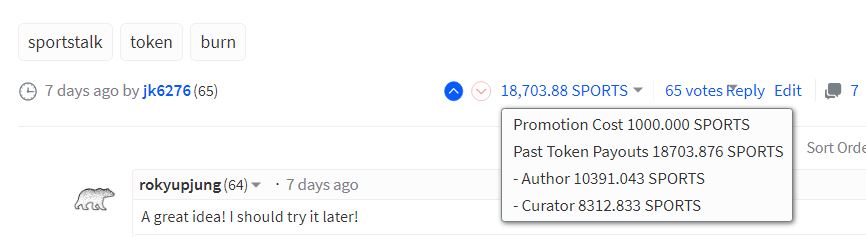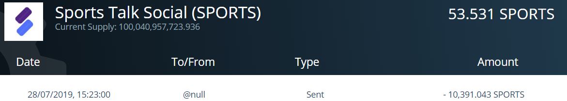 So, from my first post, a total of 11,391.043 SPORTS tokens were taken out of circulation. 1000 Promotion cost plus 10,391.043 Author reward.