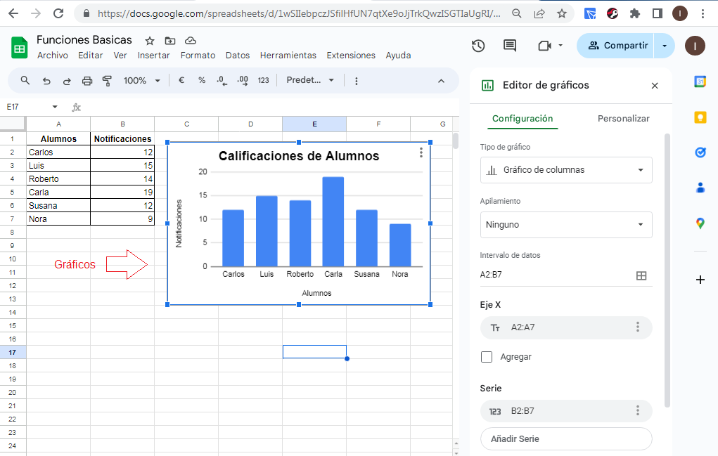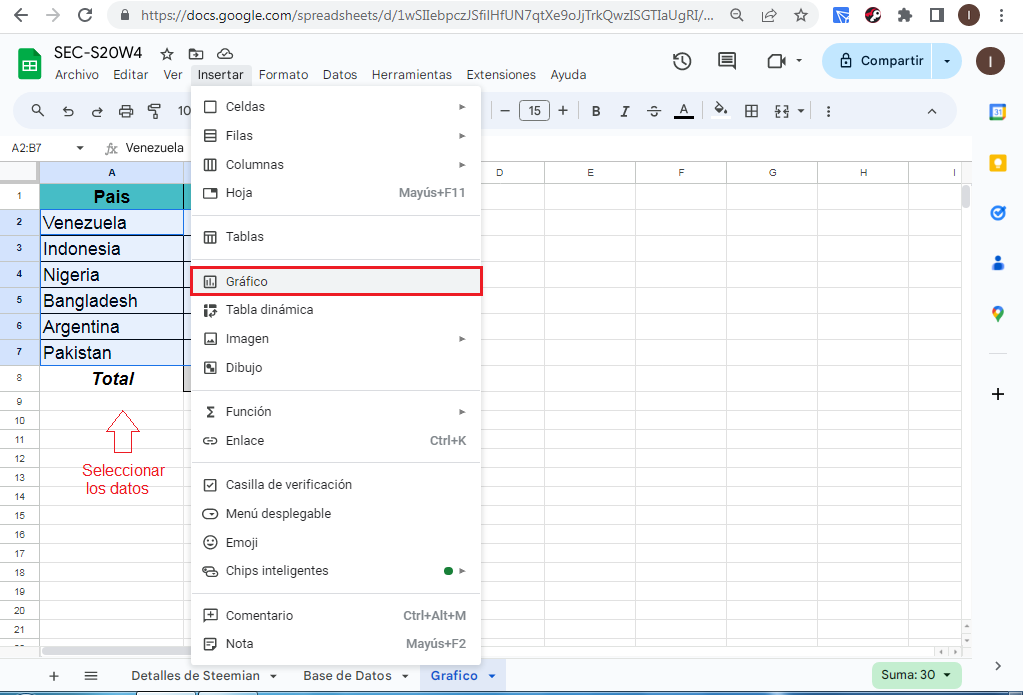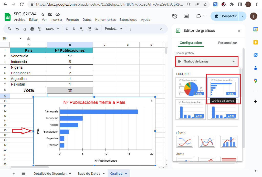 Ya teniendo los datos necesario para establecer esta relación entre el país y el numero de publicaciones, podemos seleccionar nuestros datos y hacer uso de la herramienta Gráficos. Esto lo podemos hacer al ubicarnos en la parte superior de nuestra pantalla, en la sección Insertar y seleccionar la opción Gráficos.
