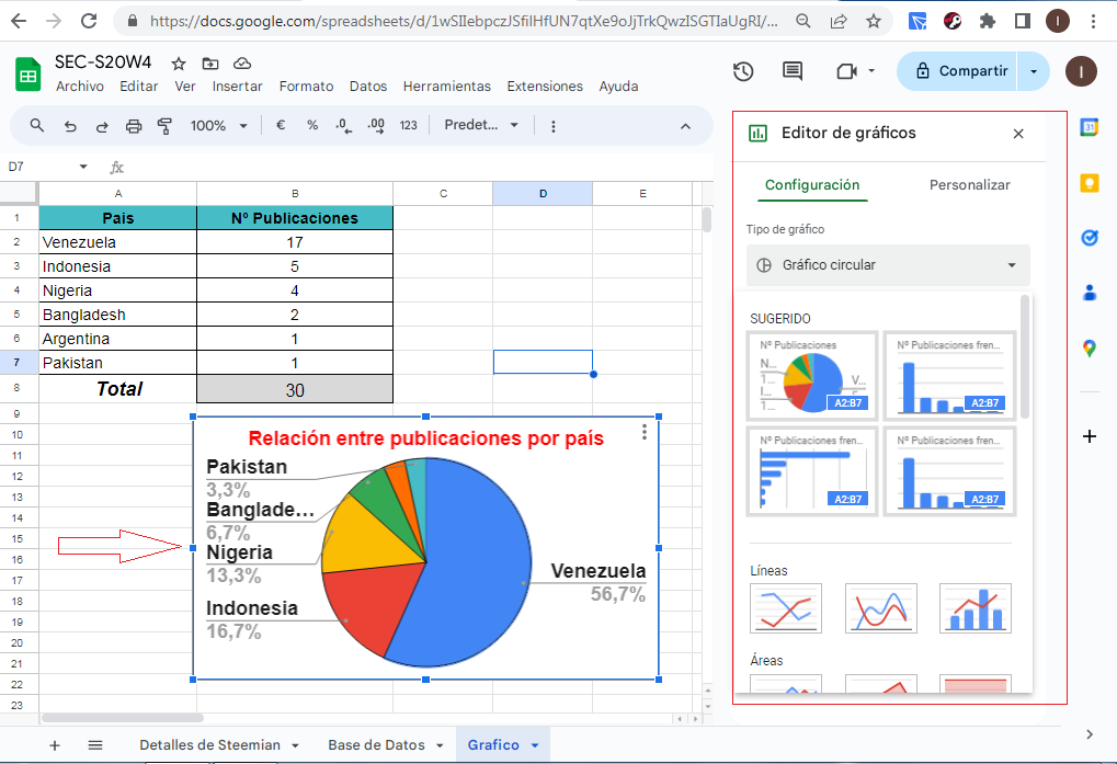 Vemos que inmediatamente nos aparece el editor de gráfico, en el cual podemos seleccionar el tipo de gráfico que queremos, que en este caso seria el de tipo circular y darle la configuración personalizada si lo deseamos.