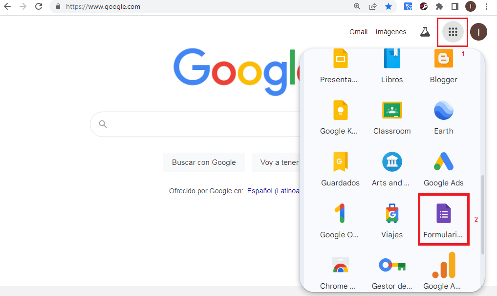 El primer paso para cumplir con esta asignación es ir a mi pagina de google y ubicarme en la parte superior a la derecha, y hacer clic en el icono de Apps de Google y seleccionar Formulario.