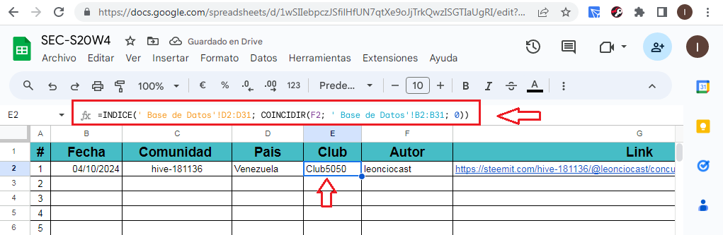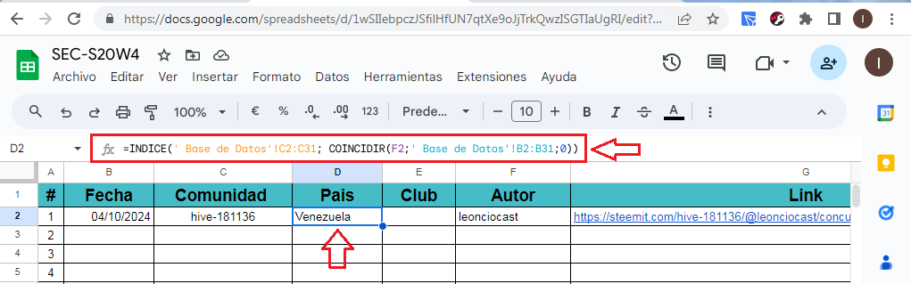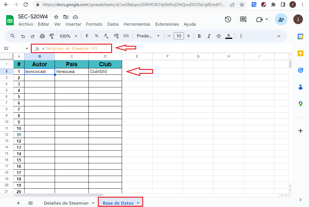 Ahora bien, volvemos a la hoja Detalles de Steemian y utilizaremos una formula para traer los datos de la pagina Base de Datos, por lo que para traer el pais de cada usuario utilice la siguiente formula: