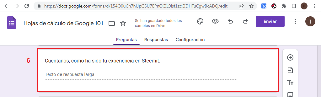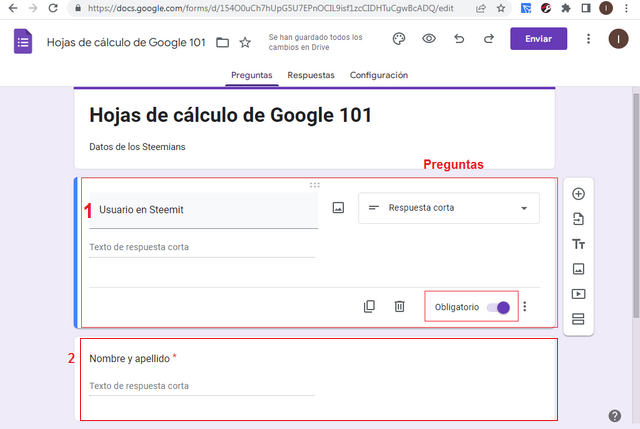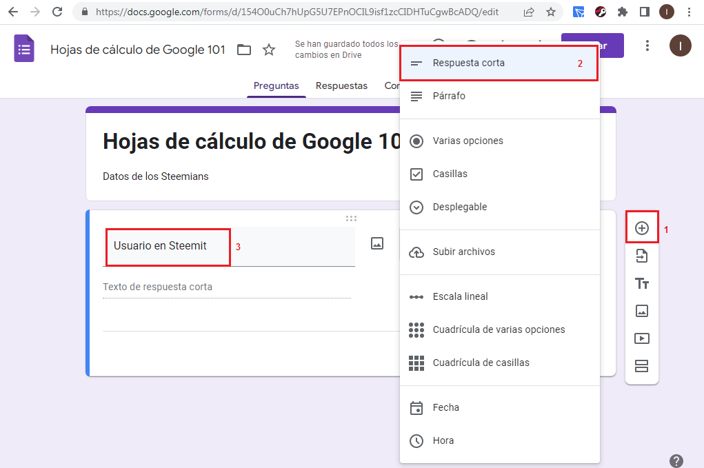 Inicia a establecer la primera primera pregunta, la cual configure para que fuera de Respuesta Corta y es para introducir el nombre de usuario en Steemit.