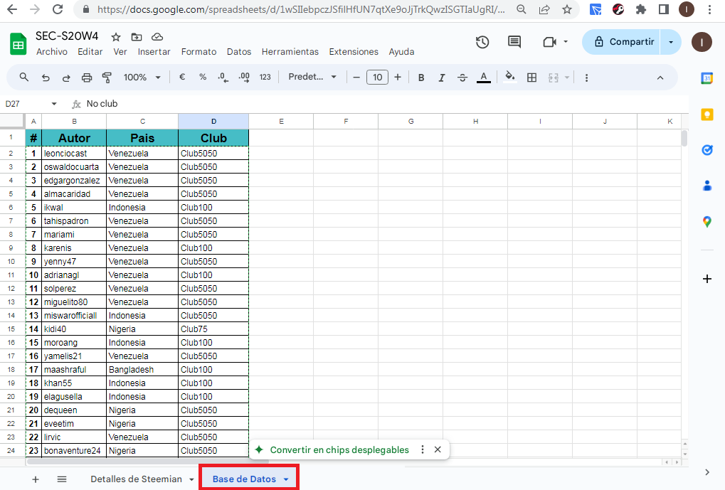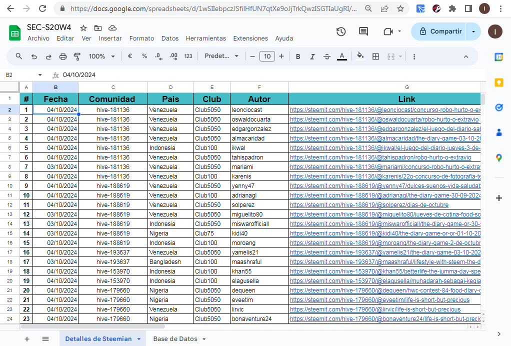 Crea una hoja de cálculo de Google titulada SEC-S20W4 con dos páginas. La primera página se llamará Detalles de Steemian y debe incluir la fecha de la publicación, la comunidad publicada, el país, el club, el autor y el enlace de la publicación, y la página siguiente se llamará Base de datos. Tu base de datos debe tener autor, país y club para que cuando se coloque un enlace de publicación en los detalles de Steemian, pueda obtener los detalles automáticamente. (Asegúrate de que tu base de datos tenga al menos 30 Steemians y lo mismo ocurre con el enlace de la publicación). Se necesitan capturas de pantalla claras para esta tarea.