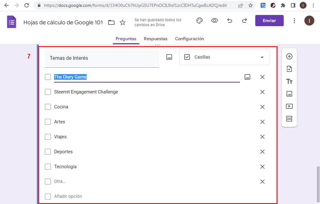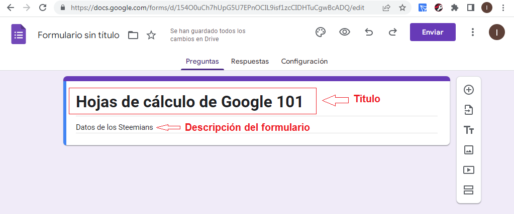 Para iniciar la creación de este formulario, lo primero es asignarle un Título. En este caso fue: Hojas de cálculo de Google 101 y como descripción: Datos de los Steemians