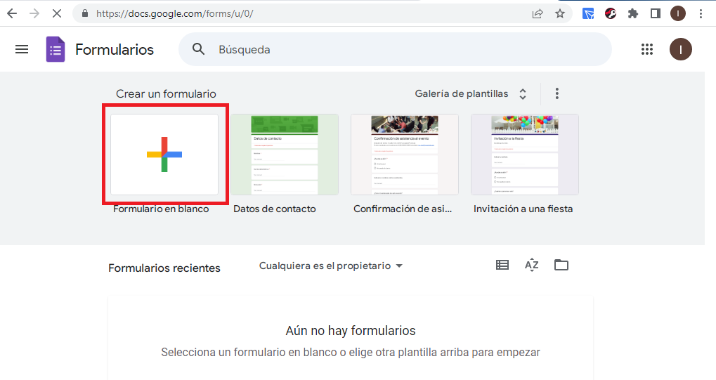 Luego debemos seleccionar la opción Formulario en blanco, para iniciar un a crear un formulario desde cero.
