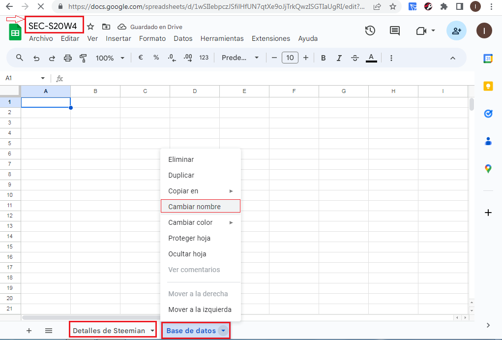 Al ingresar a mi hoja de calculo, procedí a personalizarla colocándole el titulo: SEC-S20W4 y seguidamente agregar una nueva hoja y asignarles los nombre sugeridos en esta tarea.