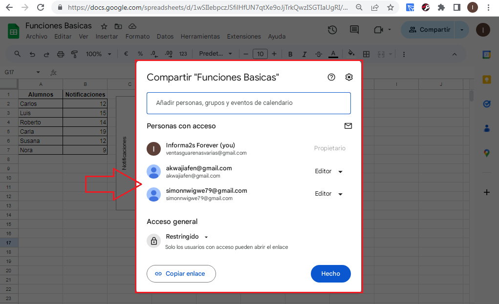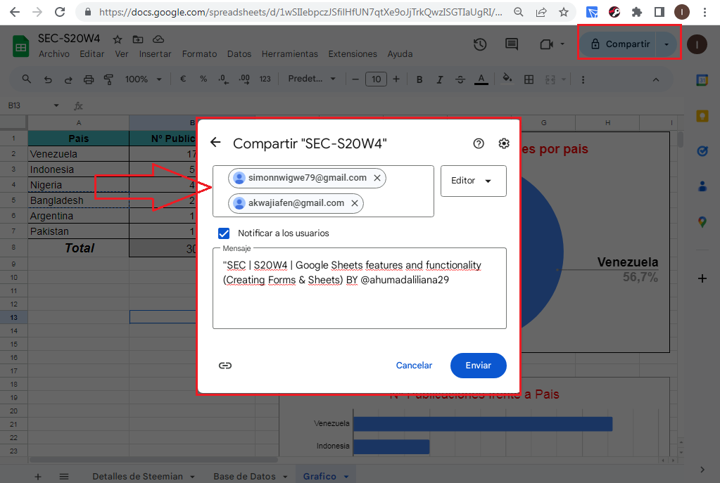 Y para culminar con los requerimientos de esta tarea, me ubique en la esquina superior derecha, haciendo clic en el botón Compartir para ingresar los correos de los profesores para que tengan acceso a mi archivo.