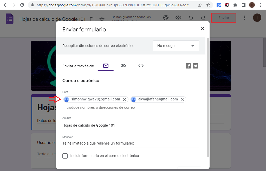 Finalmente, procedí a configurar el envió de mi formulario a la dirección de correo electrónico de los profesores. Esto lo hice al hacer clic en el botón Enviar y colocar las respectivas direcciones de sus correos como lo indicaron.