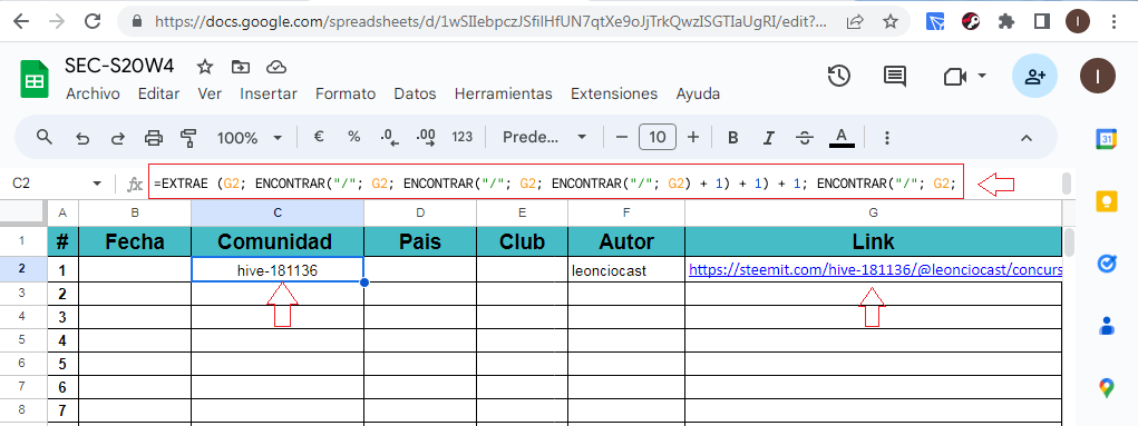Con esta formula, lo que establecí fue la búsqueda de los caracteres que se encontraran a partir del tercer "/" hasta el cuarto "/". Podemos observar que inmediatamente se extrae el nombre de la comunidad.