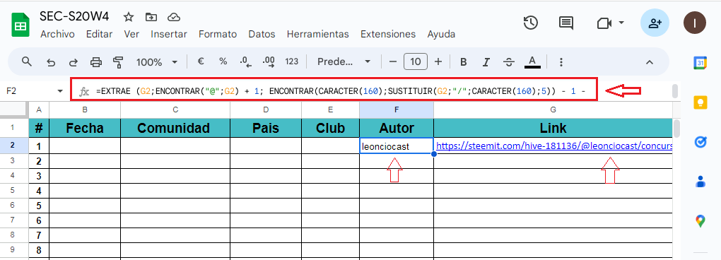 Los datos en la columna de autor corresponden a los obtenidos en la hoja Detalles de Steemian, asi que solo tuve que colocar la siguiente formula para que los datos se fueran agregando de manera automática: