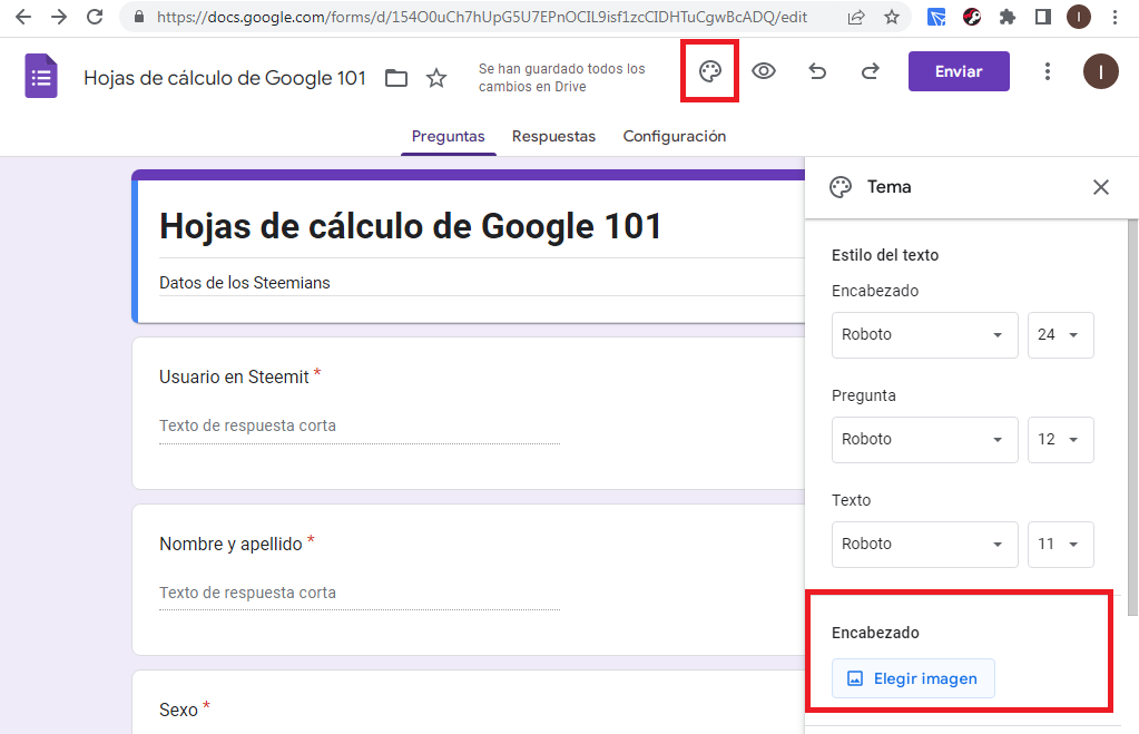 Ahora bien, para agregar un banner a nuestro formulario, nos ubicamos en la parte superior de nuestra pantalla en el lado derecho, encontraremos el icono de tema, haremos clic para personalizar nuestro formulario y seccionaremos la opción Encabeza y elegir imagen, de esta manera podremos escoger la imagen de nuestra preferencia.